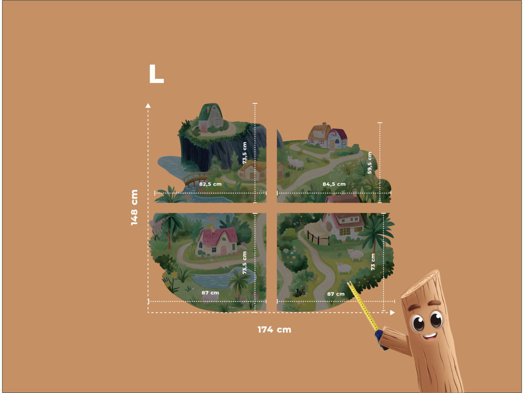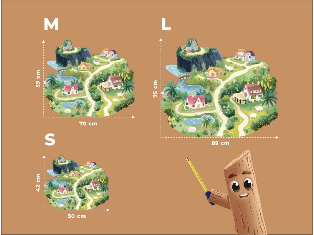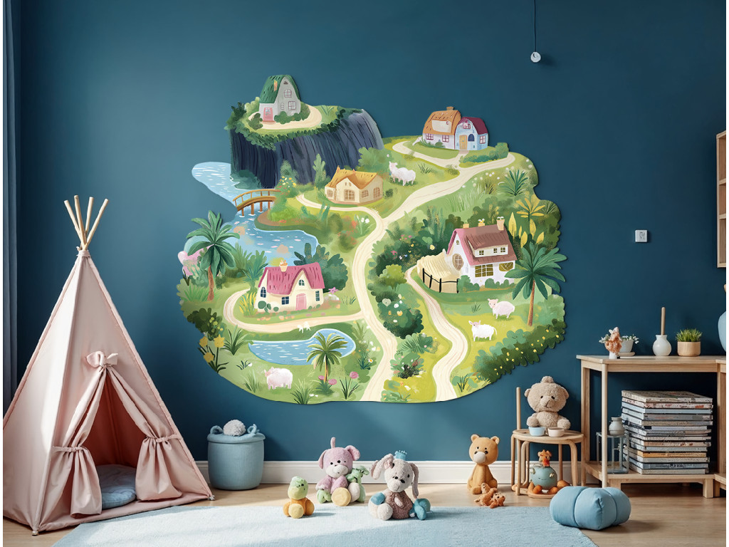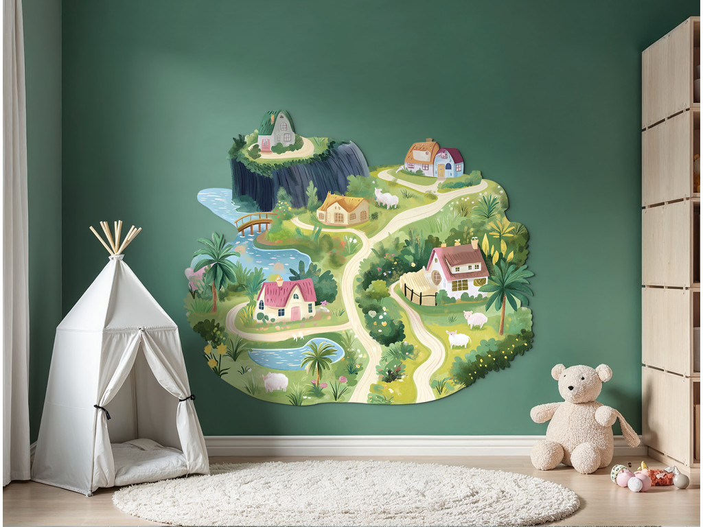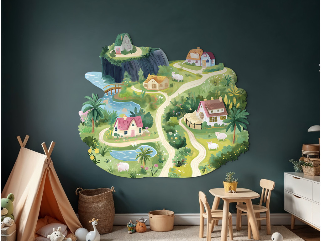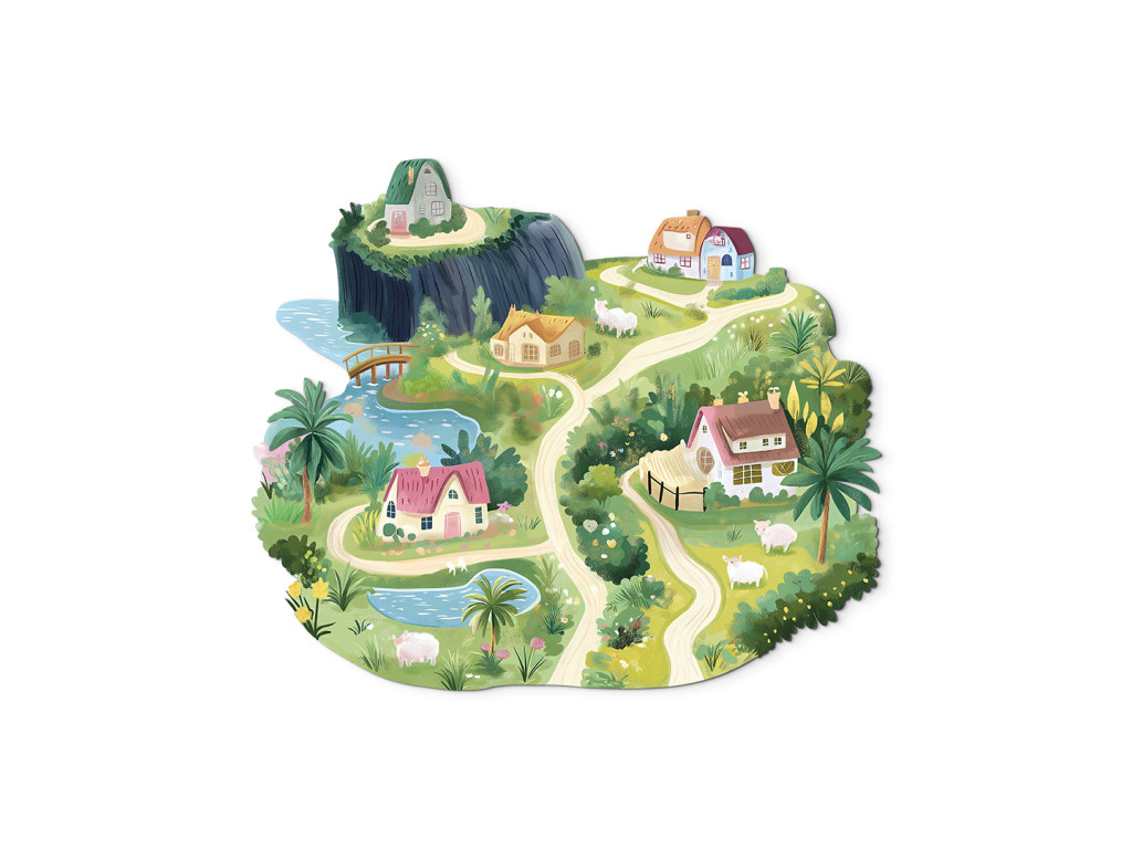 In dieser verspielten Landschaft treffen bunte Häuser, märchenhafte Wege und Tiere vom Bauernhof aufeinander. Eine Brücke führt über einen kleinen See, und überall wächst Grün – eine friedliche Welt, die zum Entdecken und Spielen einlädt.