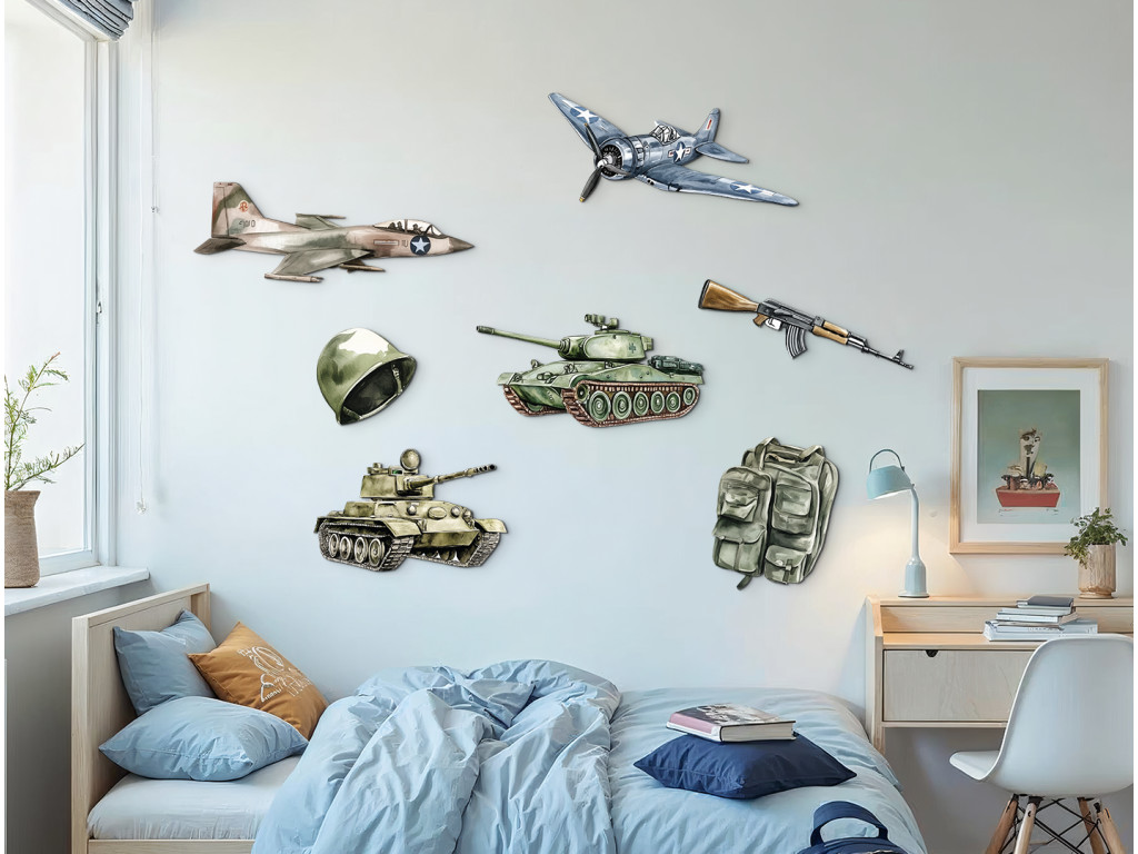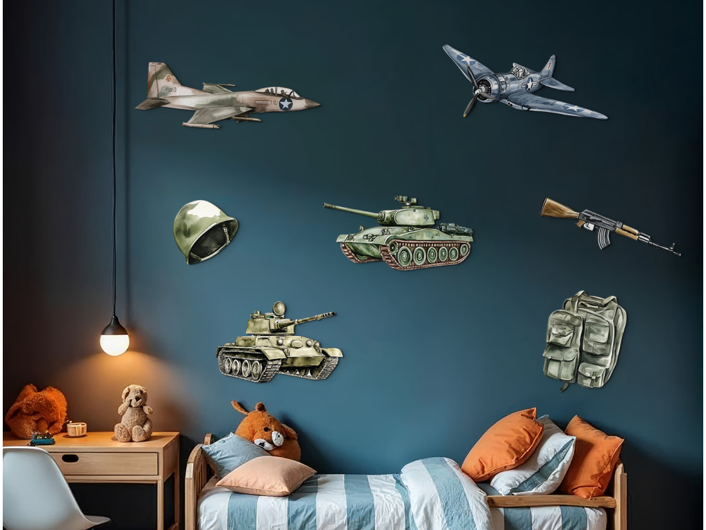 Dieses Set mit Kinderillustrationen zeigt Kampfflugzeuge, Panzer, Helme und Ausrüstung in einem verspielten, gezeichneten Stil. Militärtechnik wird hier auf sanfte Weise dargestellt, wobei der Schwerpunkt auf der kindlichen Fantasie und nicht auf dem Kampf liegt. Die ideale Ergänzung für das Zimmer eines kleinen Fans von Flugzeugen, Maschinen und Abenteuern.