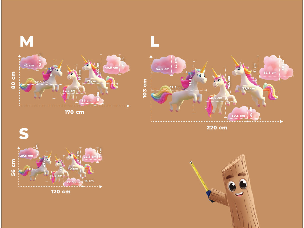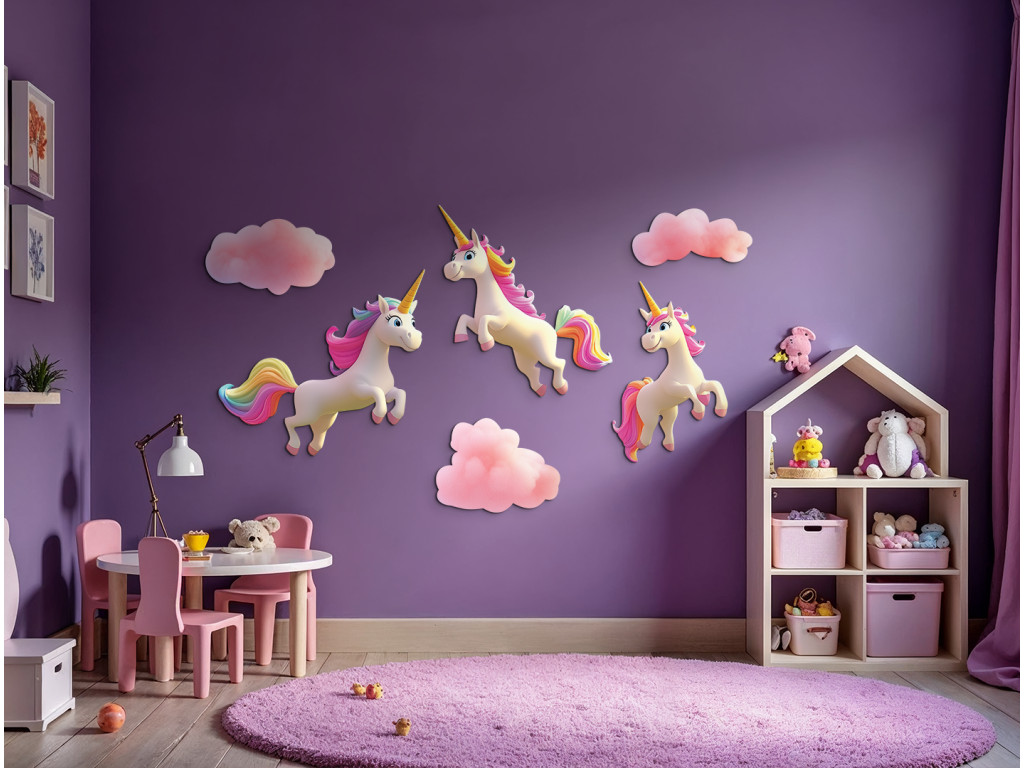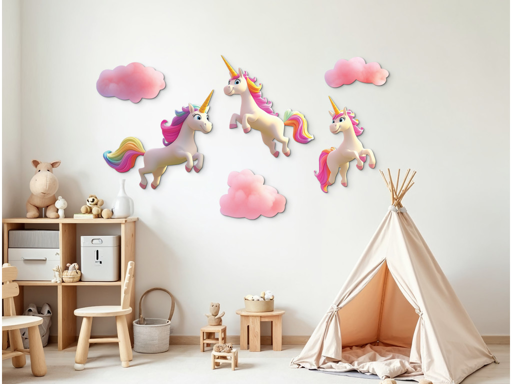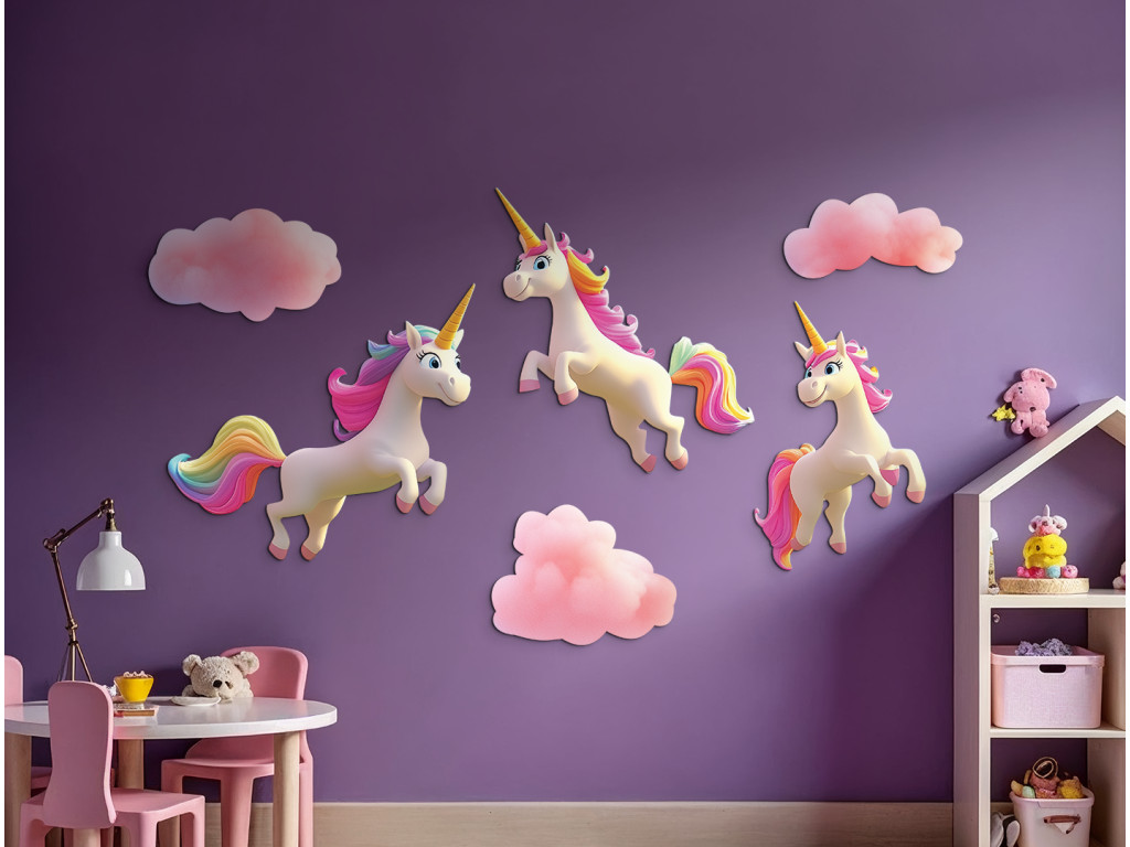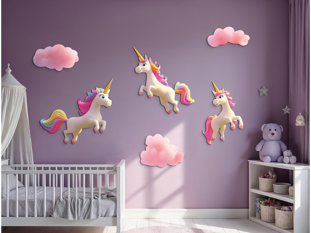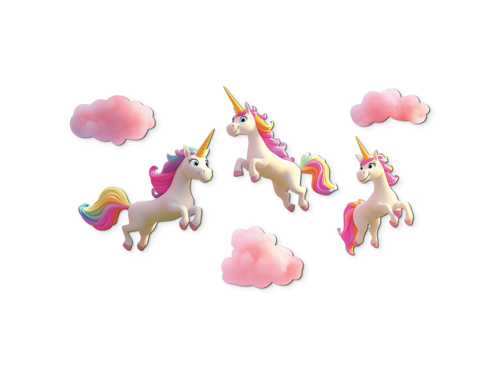 Märchenhafte Wanddekoration mit drei weißen Einhörnern mit wunderschönen Regenbogenmähnen, die zwischen zartrosa Wolken galoppieren. Ideal, um eine magische und verspielte Atmosphäre im Kinderzimmer zu schaffen.