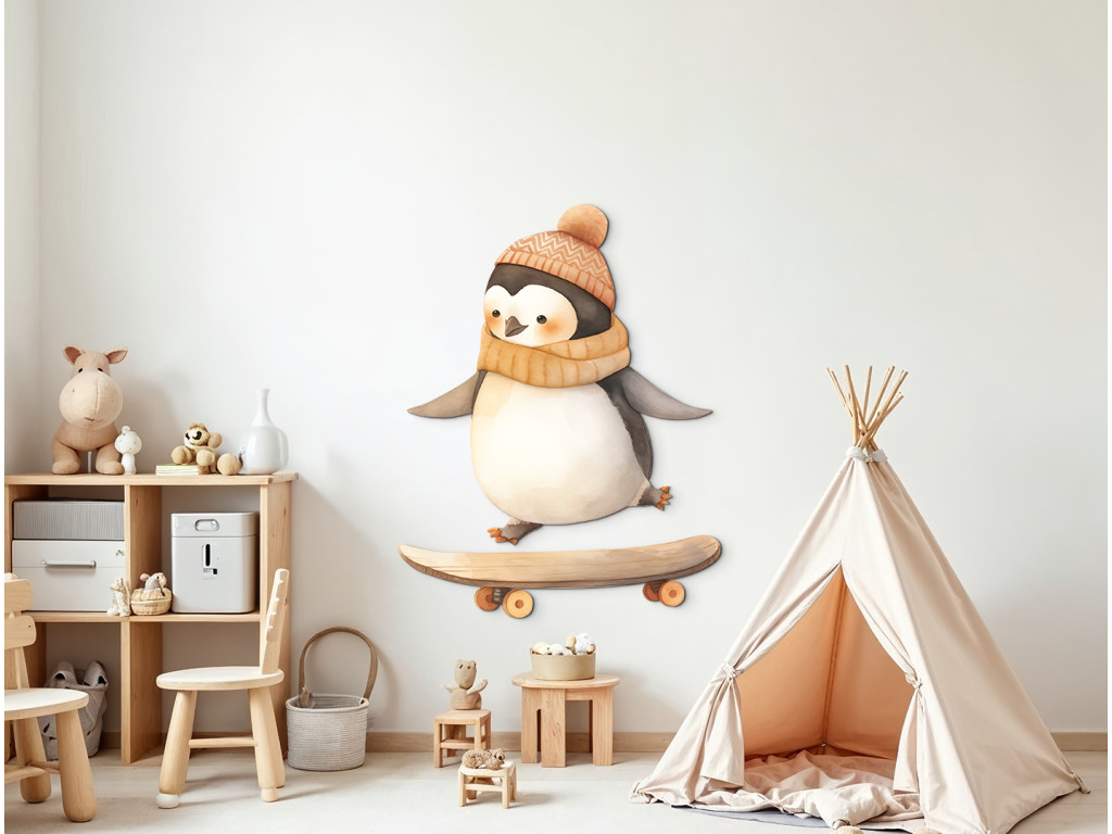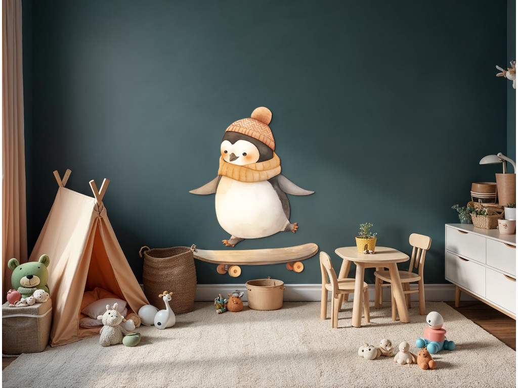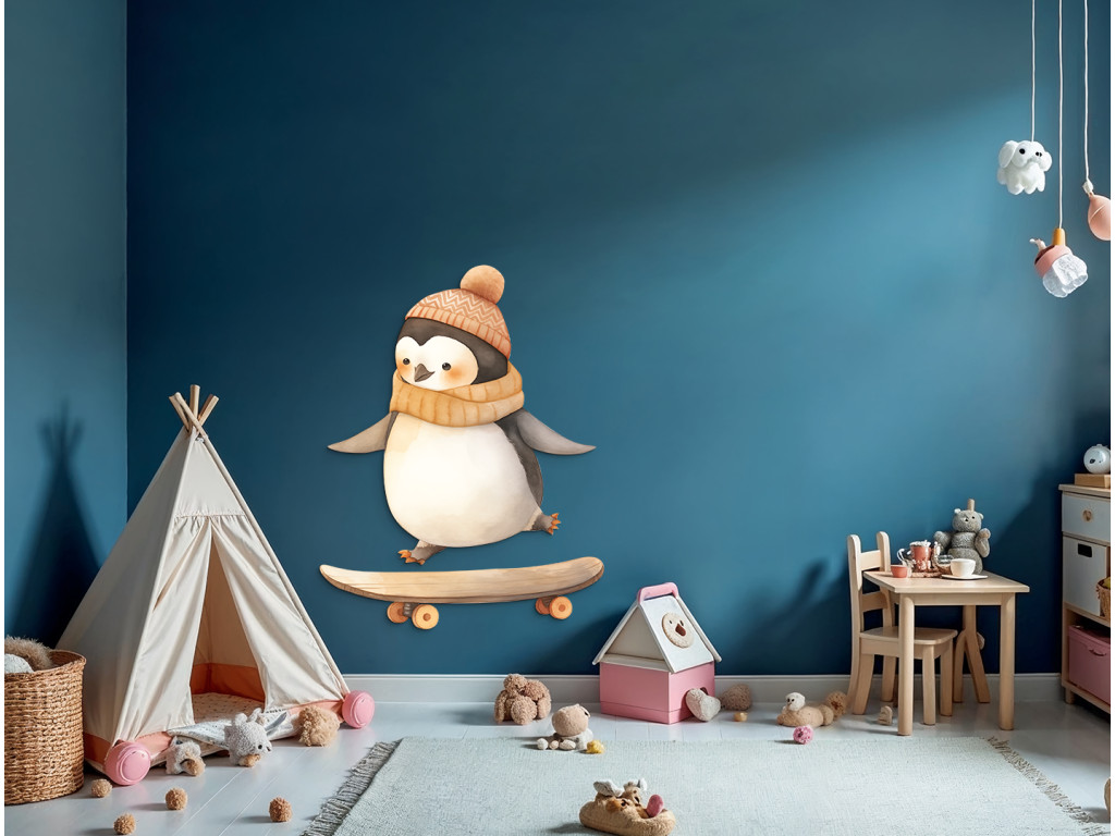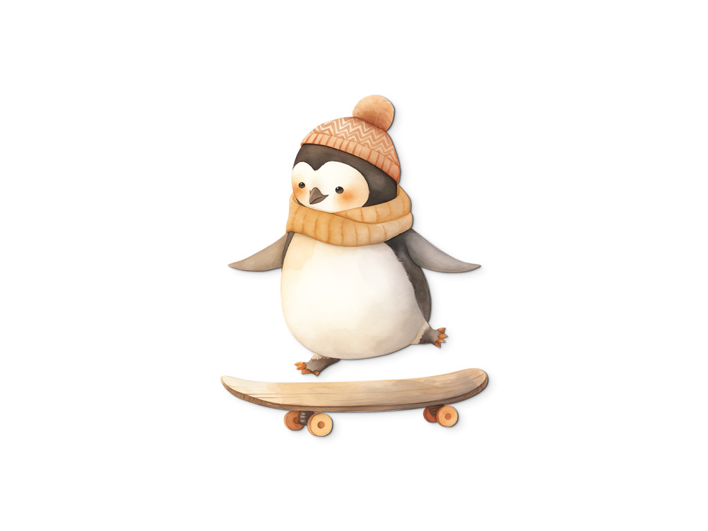 Ein niedlicher Pinguin mit Mütze und Schal bahnt sich auf seinem Skateboard seinen Weg durch die Straßen (oder Gletscher?). Dieses Bild verbindet Winter, Bewegung und Spaß – ideal für ein Kinderzimmer voller Energie und guter Laune.