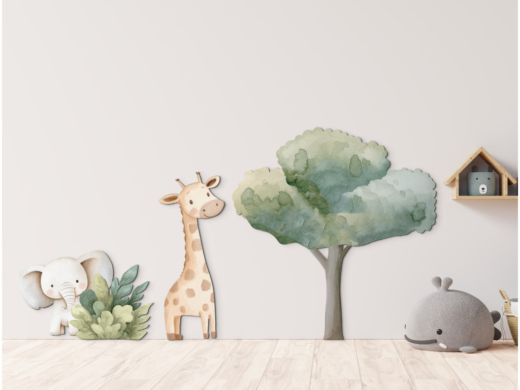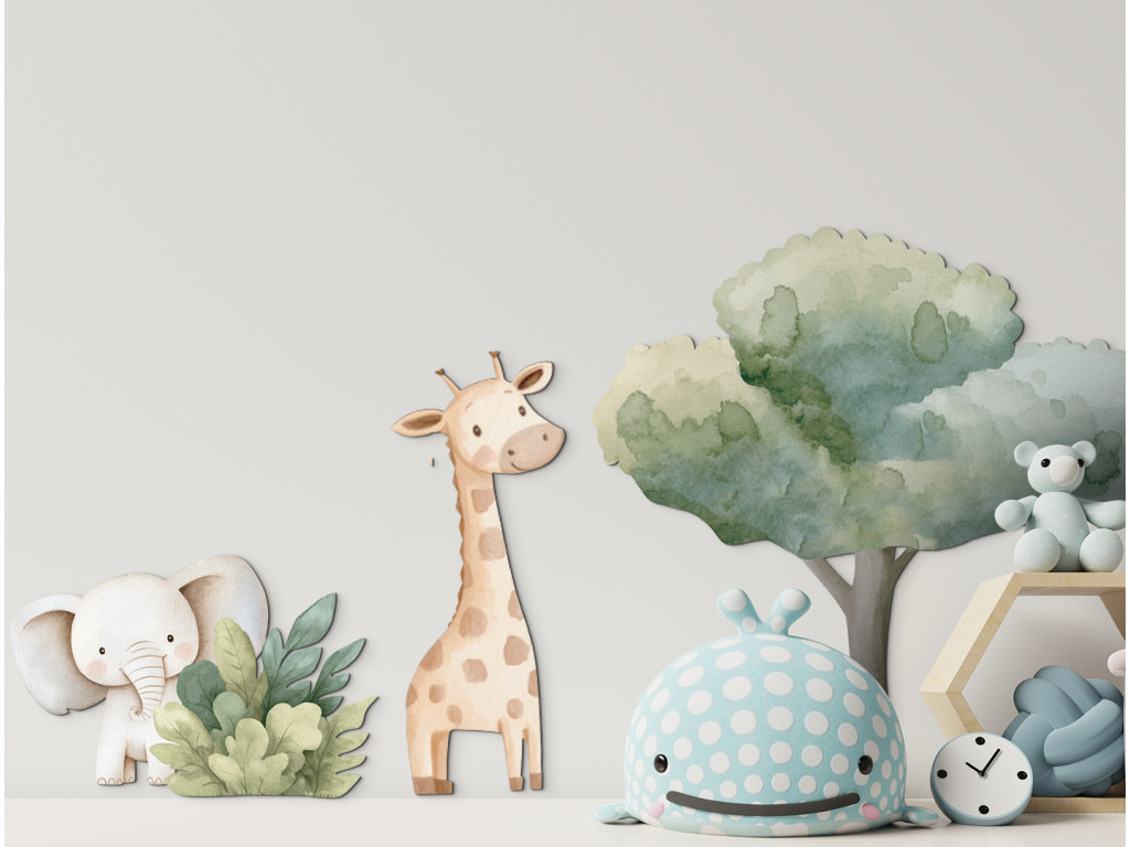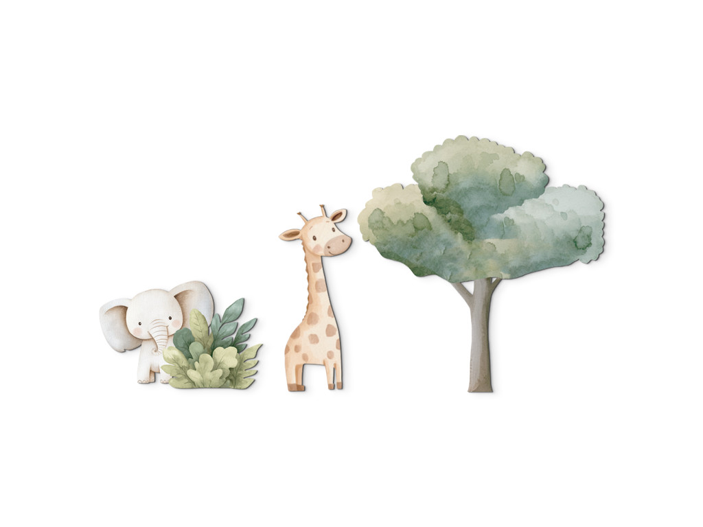 Die sanfte Giraffe steht ruhig unter einem großen Baum, während hinter einem Busch ein kleiner Elefant schüchtern hervorschaut. Die Illustration in gedämpften Naturtönen wirkt ruhig und liebevoll – eine ideale Dekoration für ein Kinderzimmer mit einem Hauch von Natur.