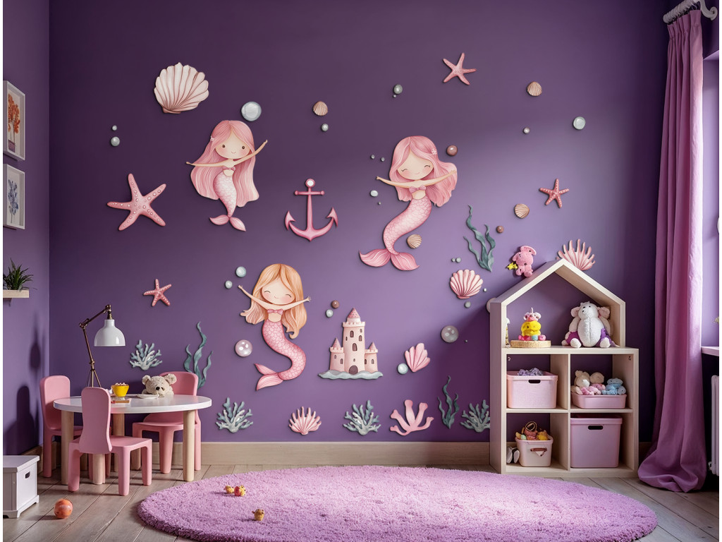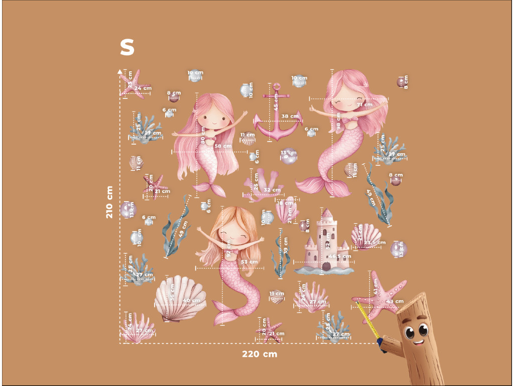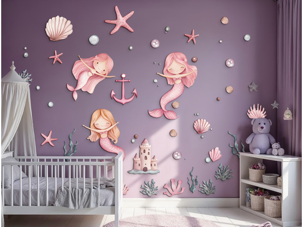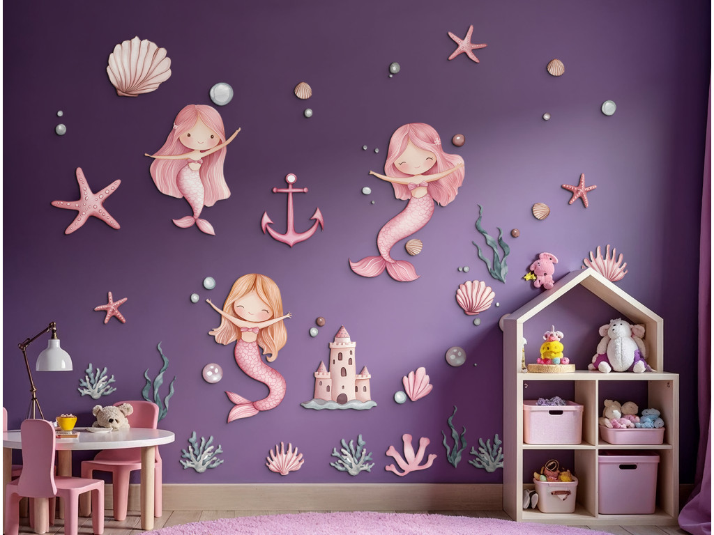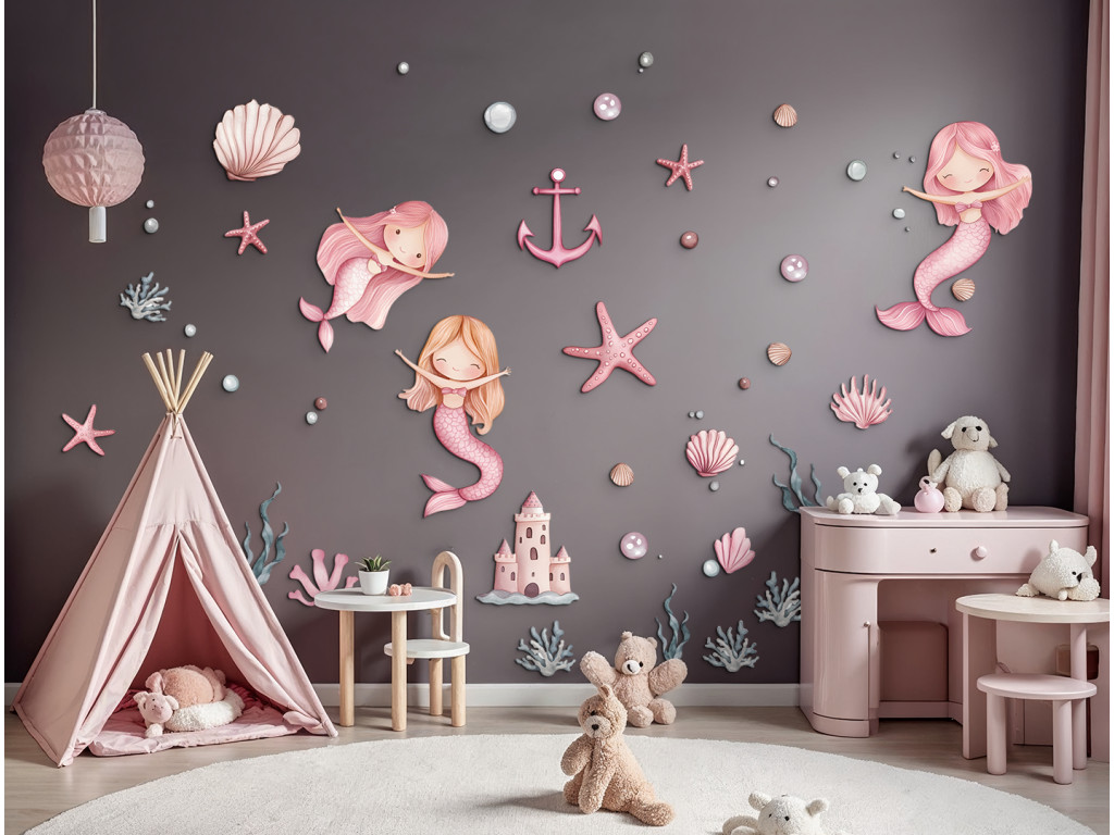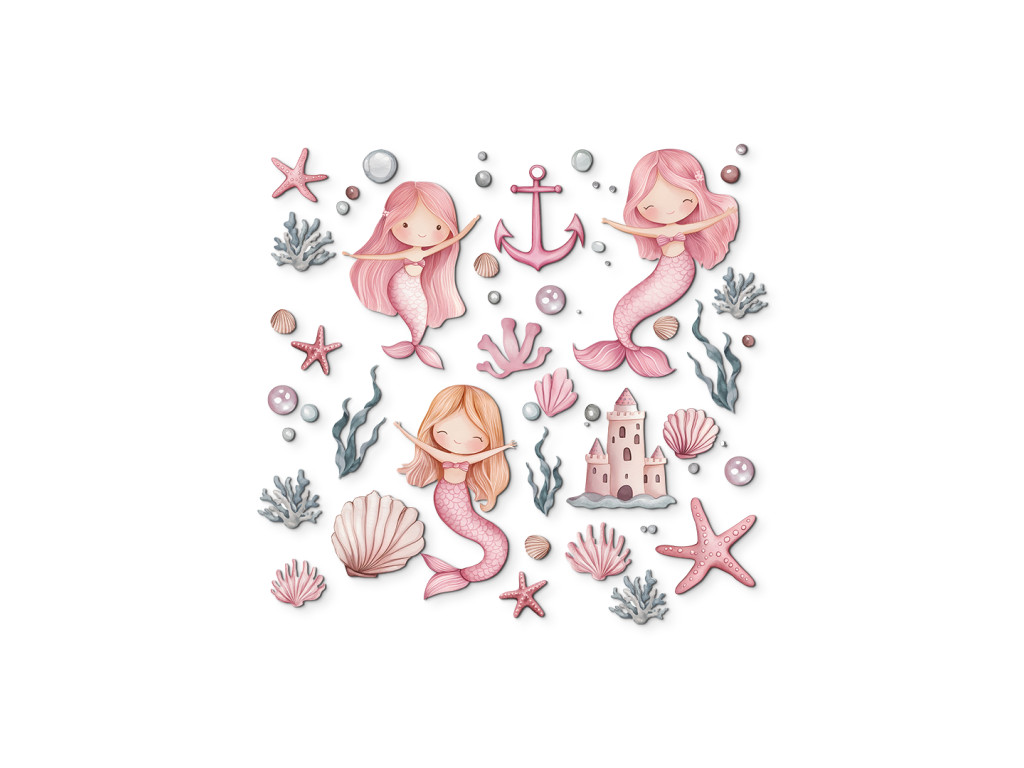 Ein Set bezaubernder Wandaufkleber mit drei Meerjungfrauen in Rosatönen, ergänzt durch Unterwasserszenen aus ihrem zauberhaften Königreich. Zarte Farben und verspielte Details verwandeln das Kinderzimmer in eine märchenhafte Unterwasserwelt voller Fantasie und Magie.