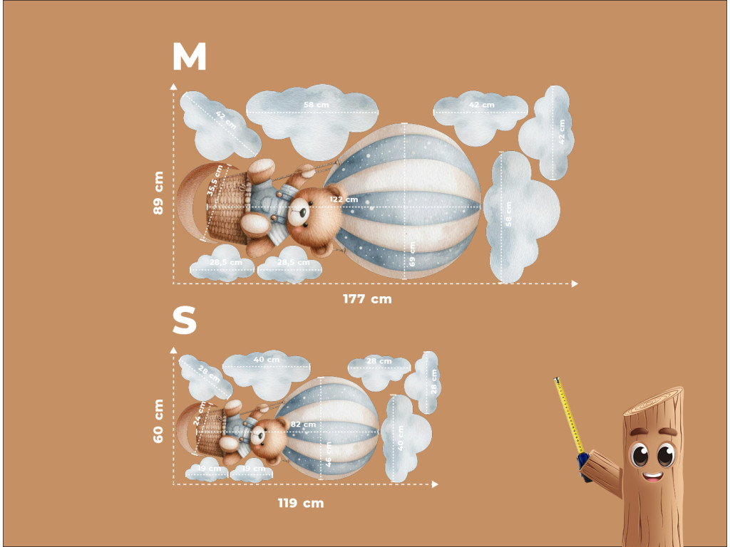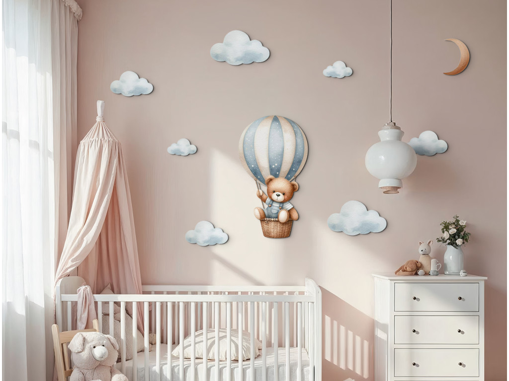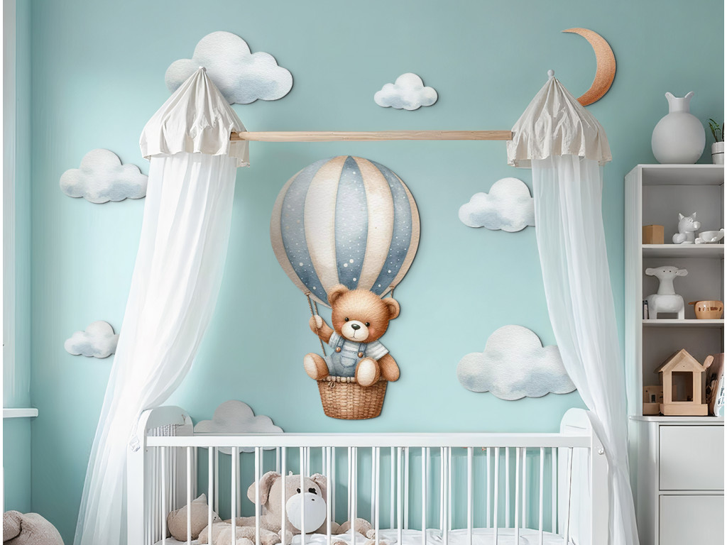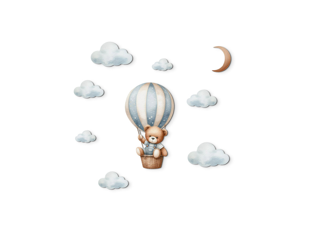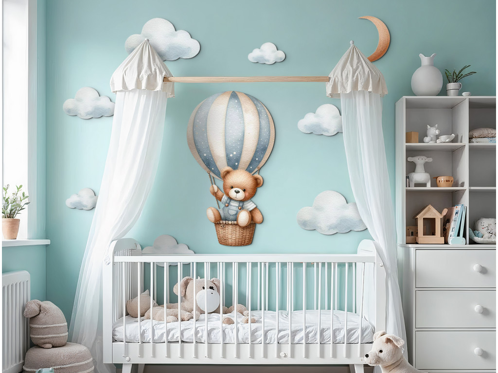 Ein niedlicher Bär schwebt in einem Heißluftballon über den Wolken. Diese zarte Illustration bringt Ruhe, Zärtlichkeit und den Zauber der Träume in das Kinderzimmer. Ein ideales Bild oder ein idealer Aufkleber für kleine Träumer.