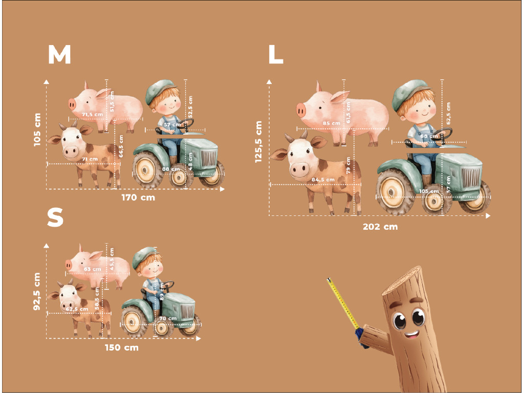 Der kleine Bauer fährt fröhlich auf seinem Traktor, begleitet von einem Schweinchen und einer Kuh – zwei treuen Freunden vom Bauernhof. Diese niedliche Illustration ist voller Farben, Bewegung und ländlichem Leben. Die ideale Dekoration für jedes Kinderzimmer für alle, die die Welt der Bauernhöfe und Tiere lieben.