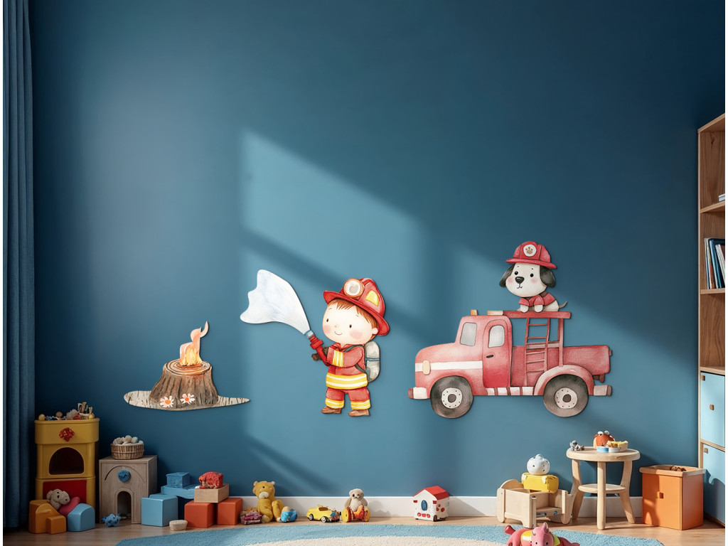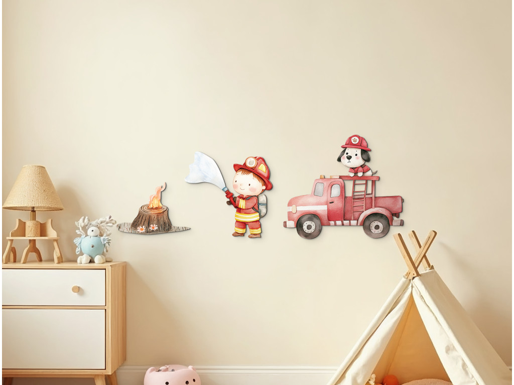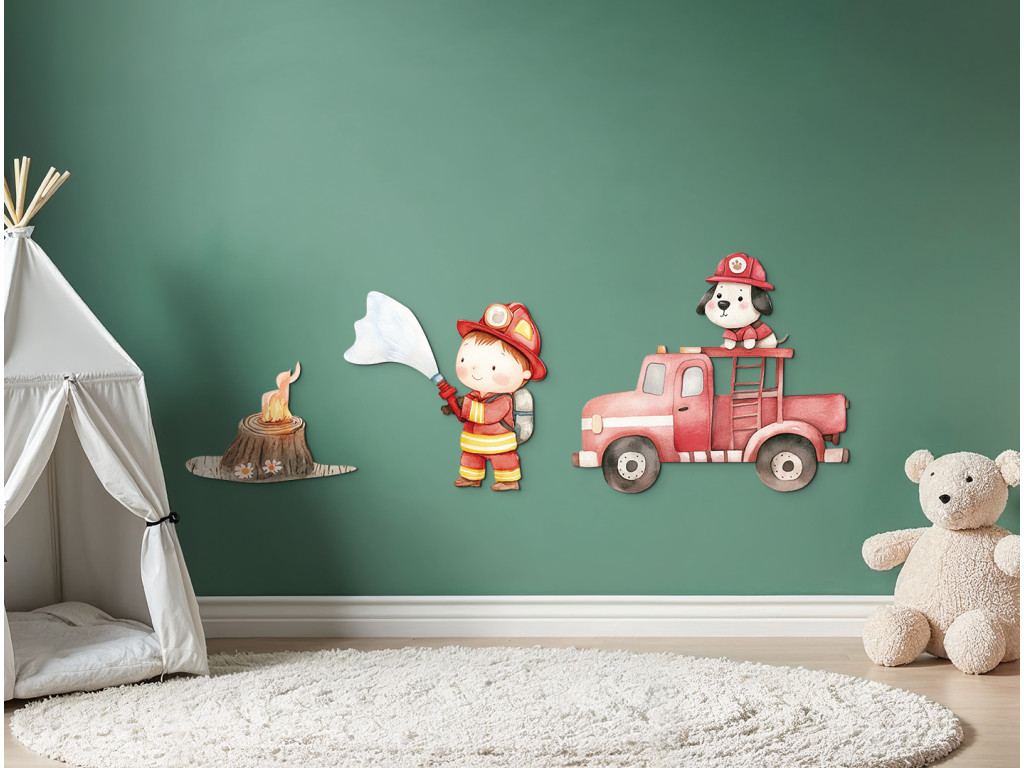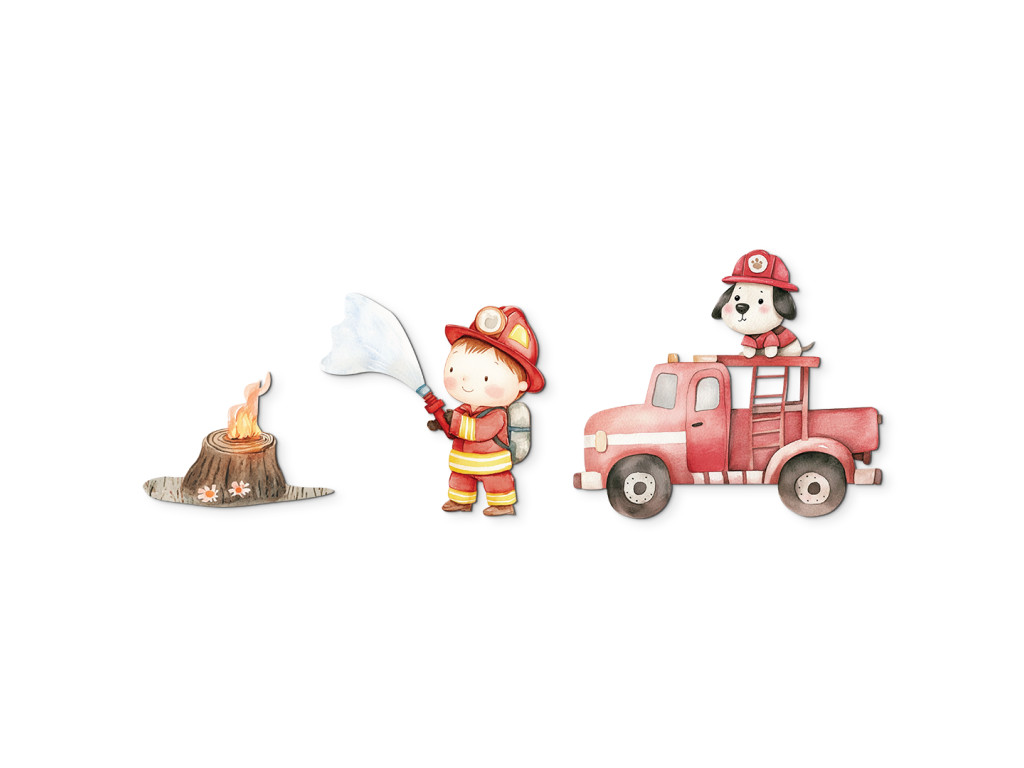 Wenn der Notruf eingeht, zögern der kleine Feuerwehrmann und sein Hündchen am Steuer des Feuerwehrautos keine Sekunde! Ein fröhliches Bild voller Bewegung, Teamwork und kindlicher Tapferkeit. Verschönern Sie die Kinderwelt Ihrer kleinen Retter.