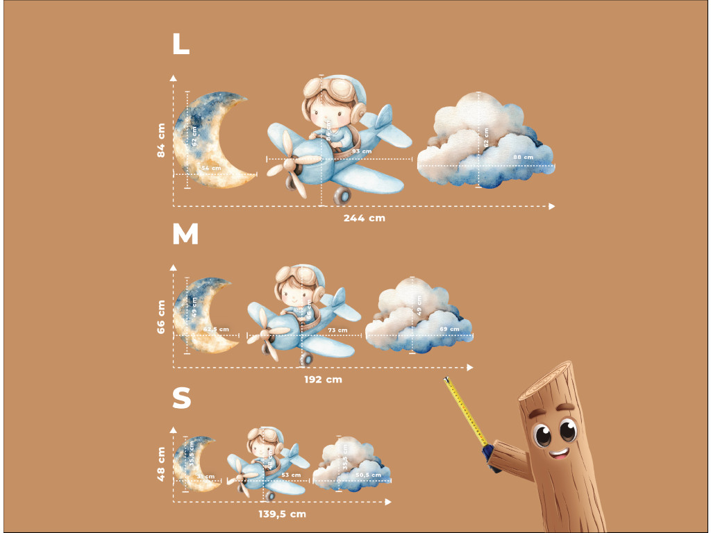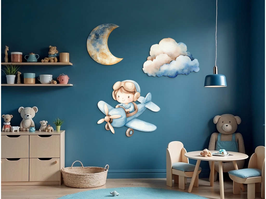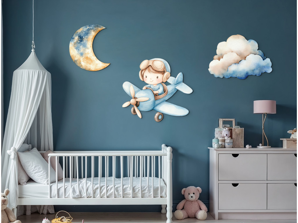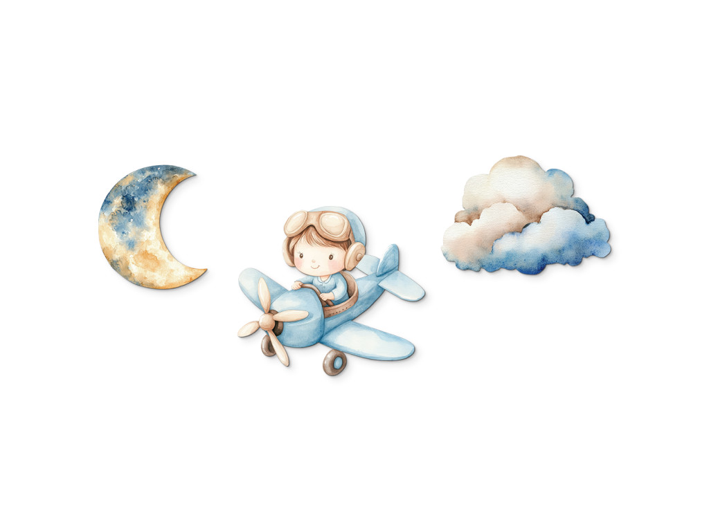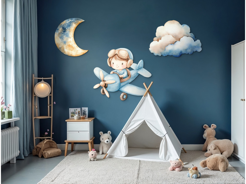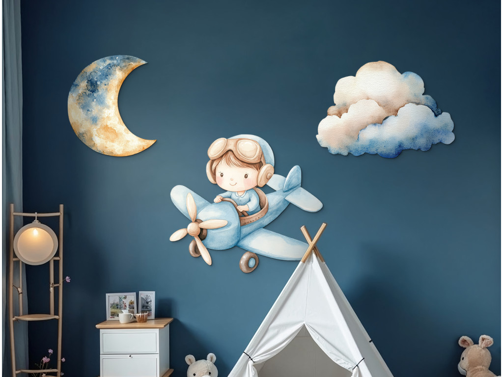 Das fröhliche blaue Flugzeug wird von einem kleinen gezeichneten Piloten gesteuert – einem lächelnden Kleinkind, das zwischen Wolken und dem strahlenden Mond fliegt. Zarte Pastellfarben und ein verspieltes Motiv verleihen dem Kinderzimmer ein Gefühl von Freude und Abenteuer. Ideal für kleine Entdecker.