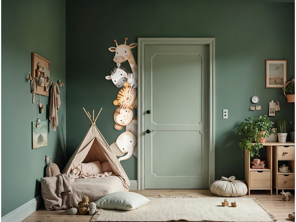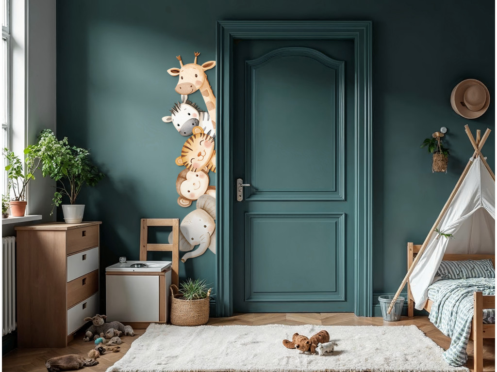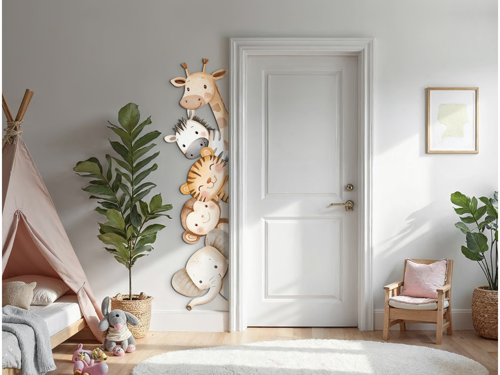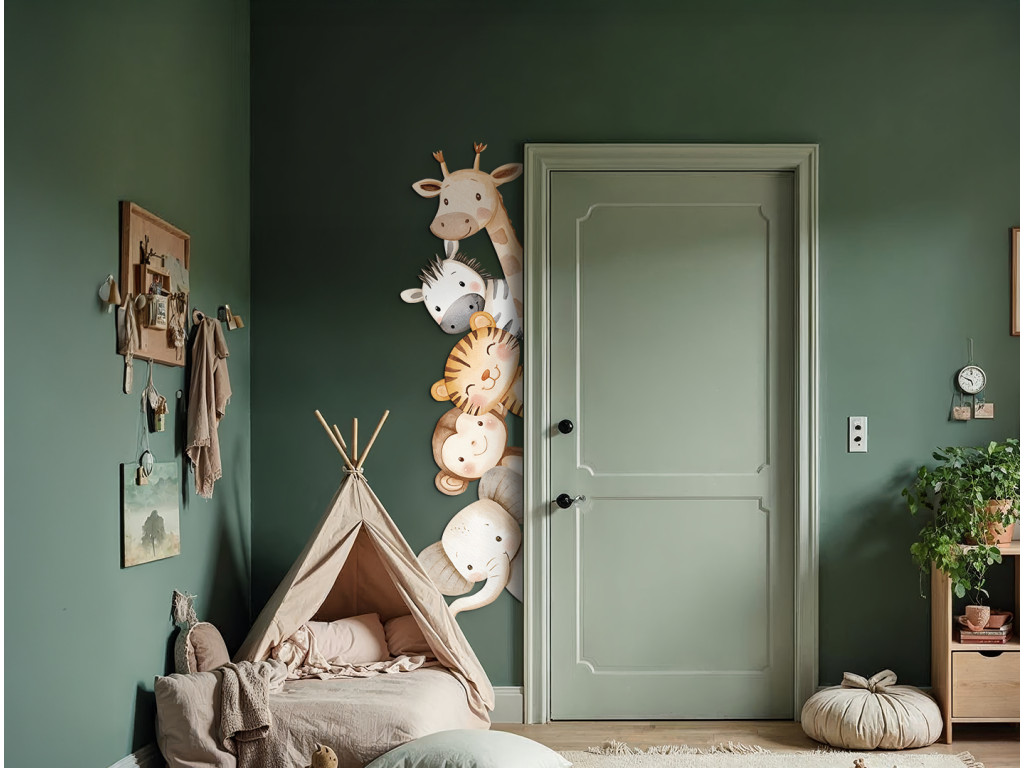 Fröhliche Wanddekoration mit niedlichen Cartoontieren aus der Savanne wie Giraffe, Zebra, Löwe, Affe und Elefant in sanften Pastellfarben. Das Motiv ist so gestaltet, dass es den Eindruck erweckt, als würden die Tiere aus der Ecke der Wand oder hinter der Tür hervorschauen, wodurch sie dem Kinderzimmer eine verspielte und freundliche Note verleihen.