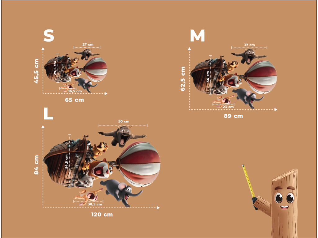 In dieser verspielten Wanddekoration fliegt ein Schiff, das an einem Ballon hoch über dem Boden hängt, voller fröhlicher Tiere auf einem Ausflug. Einige springen bereits während der Fahrt heraus, bereit, die Wolken und Abenteuer zu erkunden, die auf sie warten. Die Farben und liebevollen Details machen diese Szene zu einer unterhaltsamen und fantasievollen Dekoration für das Kinderzimmer.