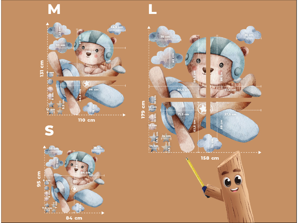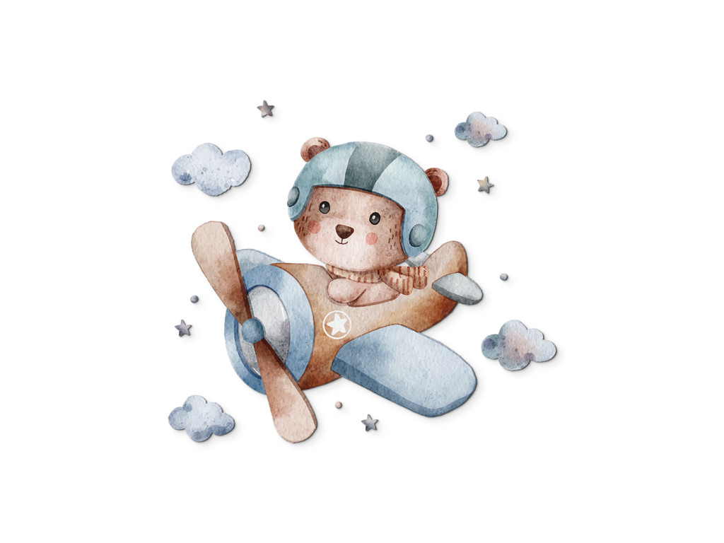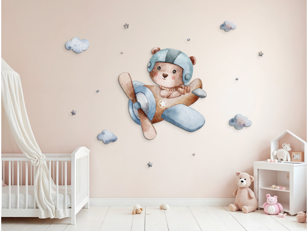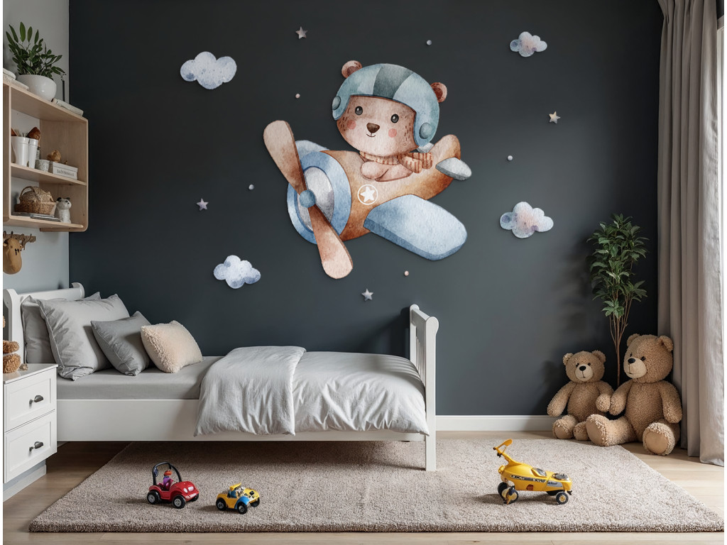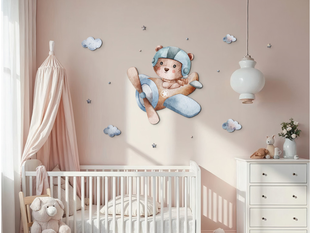 Ein niedlicher Bärencharakter mit Fliegerhelm steuert ein blaues Flugzeug, mit dem er über weiche Wolken schwebt. Diese verspielte Dekoration in sanften Farben verleiht dem Kinderzimmer einen Hauch von Abenteuer und eine fröhliche Atmosphäre.