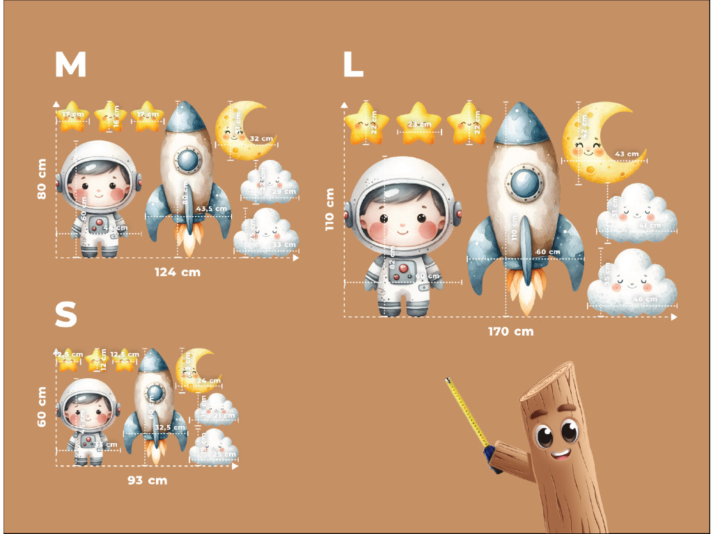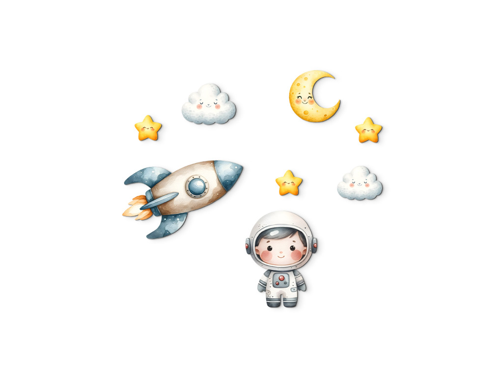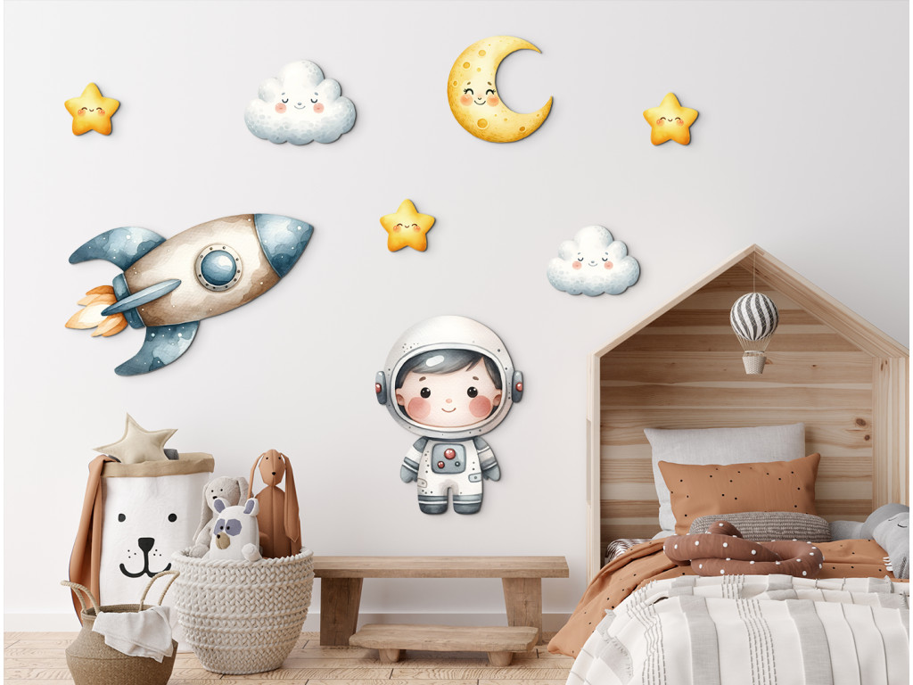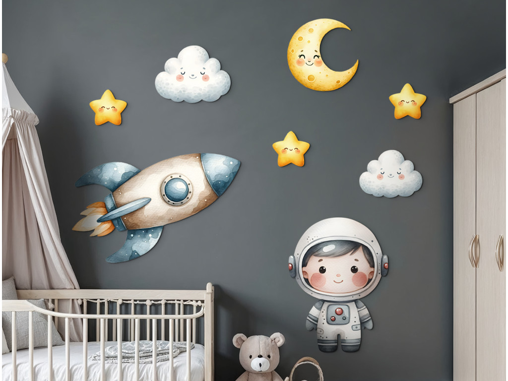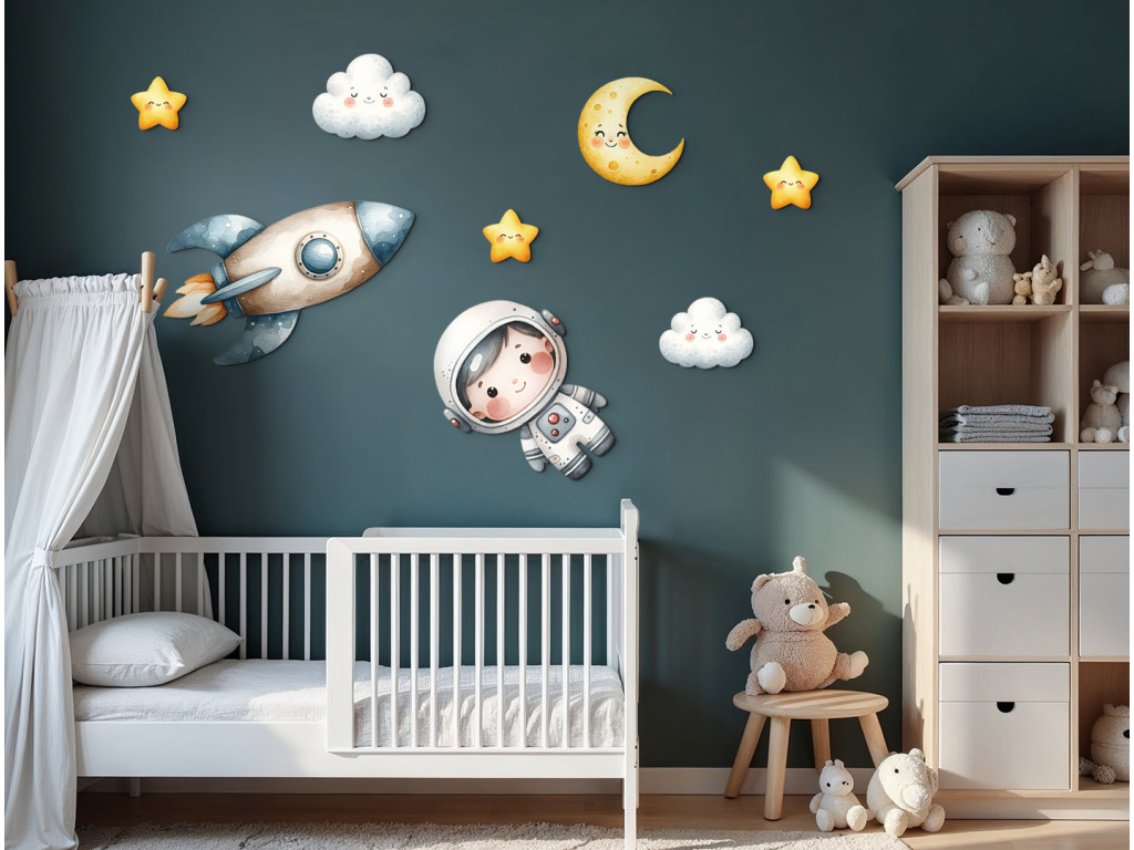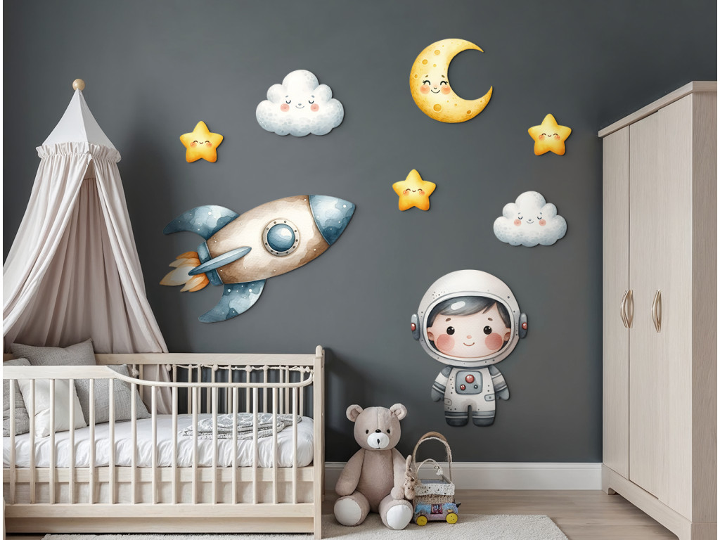 Die Dekoration zeigt eine große gezeichnete Rakete, die in der Mitte der Komposition schwebt, umgeben von gelben Sternen und lächelnden Wolken, einen Mond mit freundlichem Gesicht, der der Szene eine verspielte und gemütliche Note verleiht, und einen niedlichen kleinen Astronauten im Raumanzug, der bereit ist, sich auf sein Weltraumabenteuer zu begeben. Das gesamte Motiv ist ideal, um ein Kinderzimmer zu beleben und die Fantasie anzuregen.