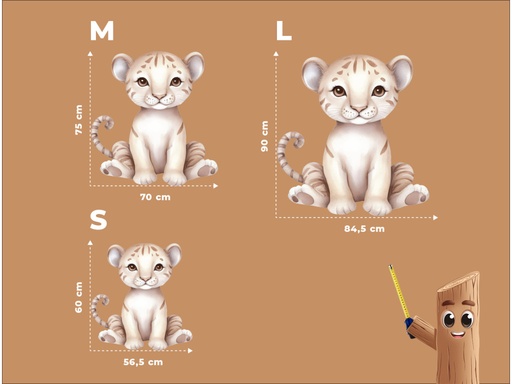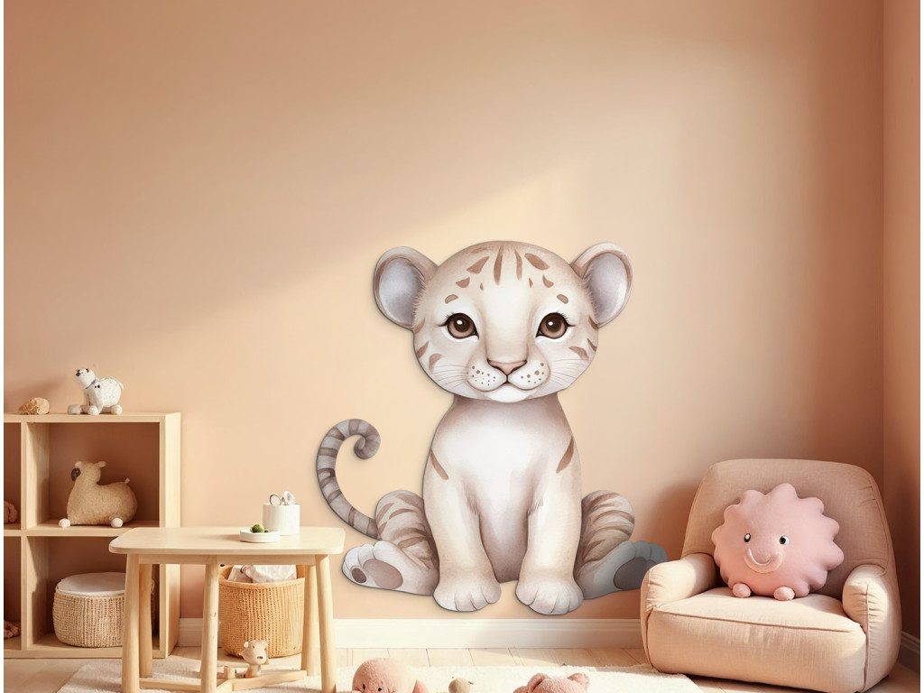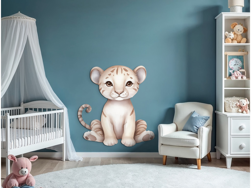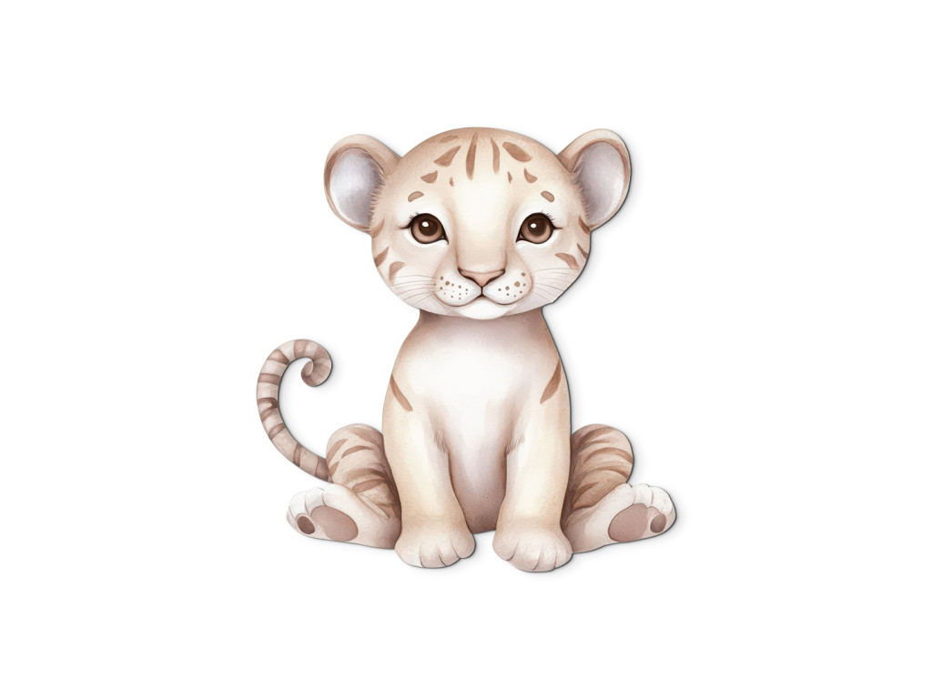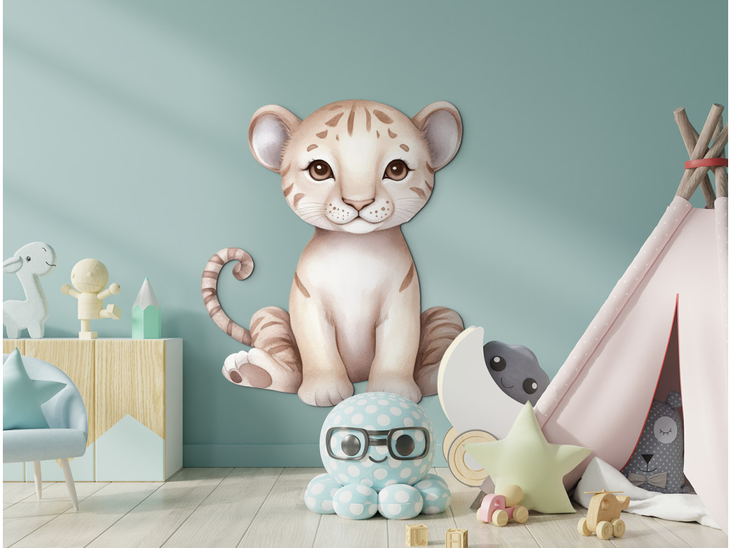 Kleiner Tiger als zärtlicher Wächter des Kinderzimmers. UV-Druck auf PVC-Platte, in Form geschnitten, zum Aufhängen oder Aufkleben vorbereitet.