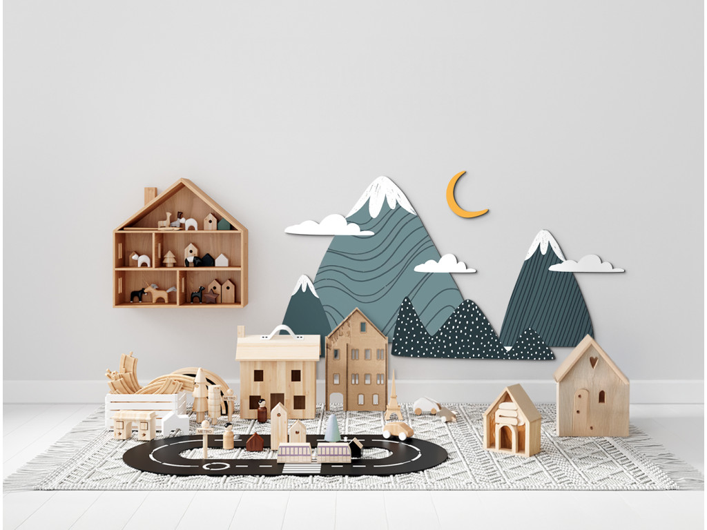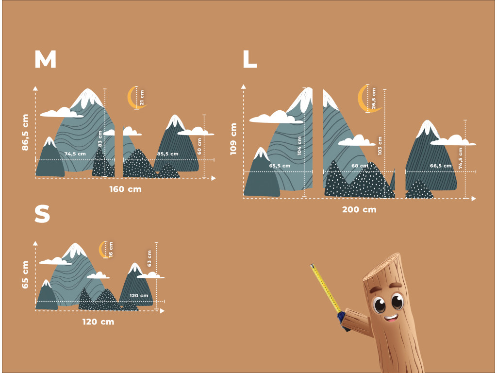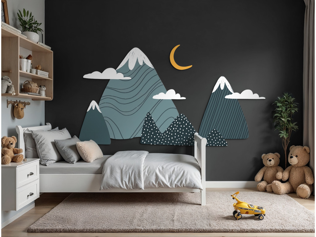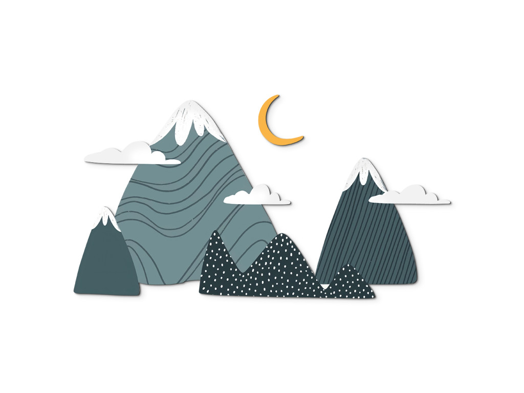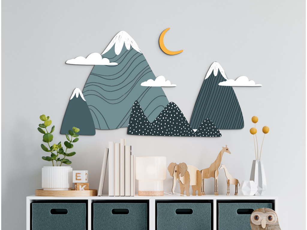 Das dekorative Motiv in Form von aufgeklebten Bergen, Wolken und einem gelben Mond schafft eine verspielte und ruhig wirkende Nachtszene. Die Berge in Blau- und Grüntönen werden durch Schneegipfel und verschiedene Muster ergänzt, die der gesamten Komposition Textur und Dynamik verleihen. Ideal als dezente Wanddekoration für Kinderzimmer oder Räume, in denen ein Gefühl von Ruhe, Natur und Fantasie vorherrschen soll.