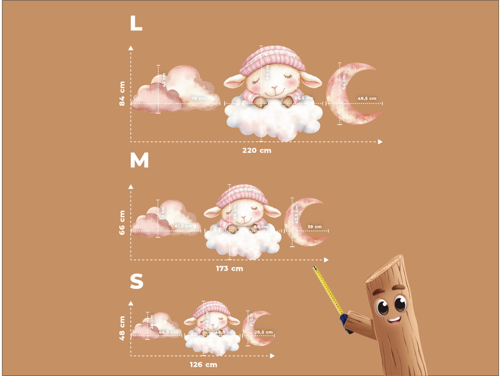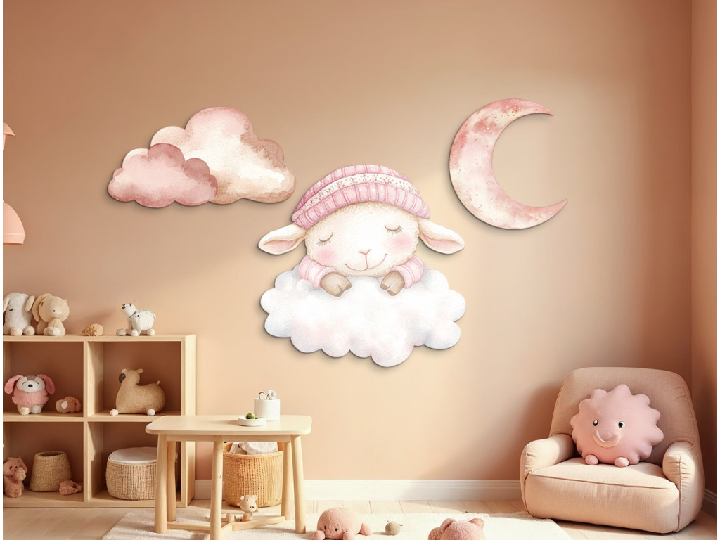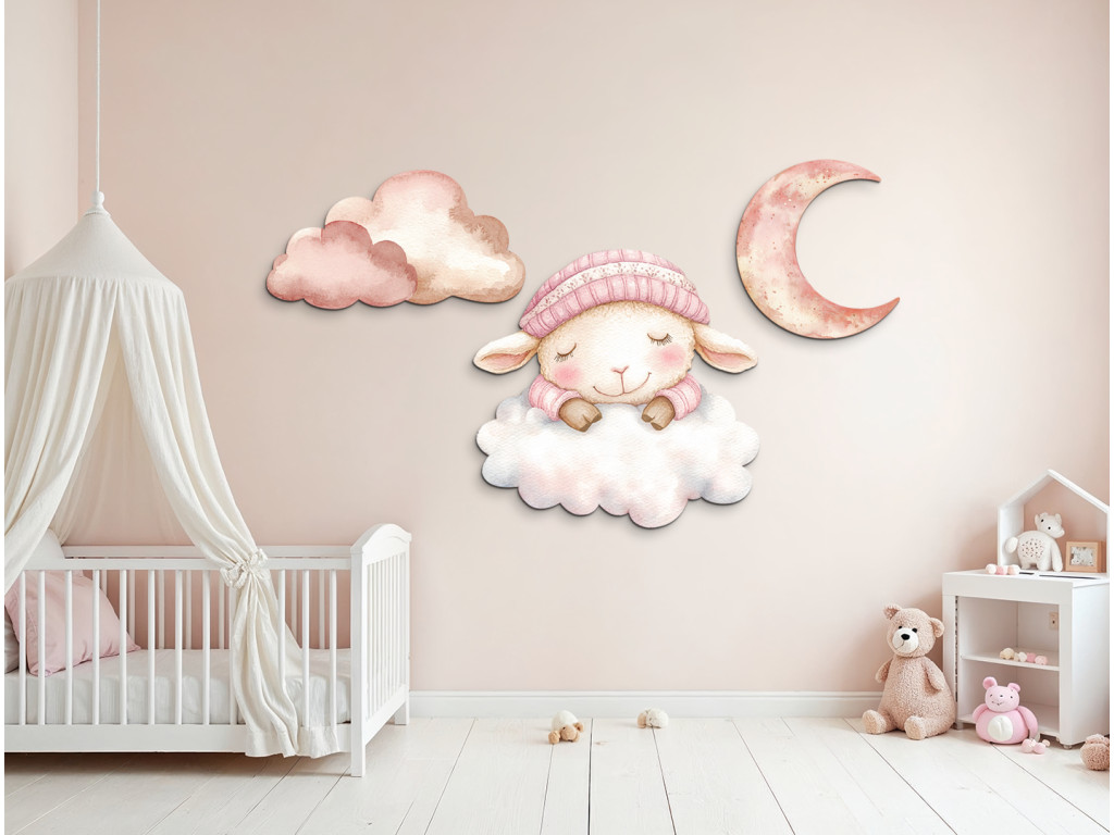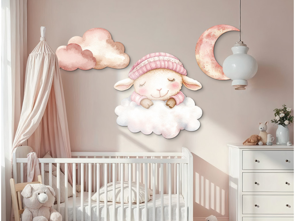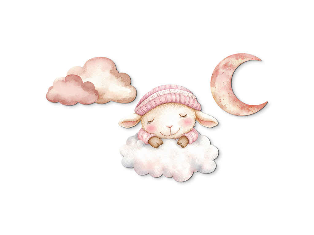Entzückende gezeichnete Dekoration in Rosa- und Weißtönen, die ein Schäfchen zeigt, das friedlich auf einer weichen Wolke ruht. Ideal, um eine sanfte, beruhigende Atmosphäre im Kinderzimmer zu schaffen.