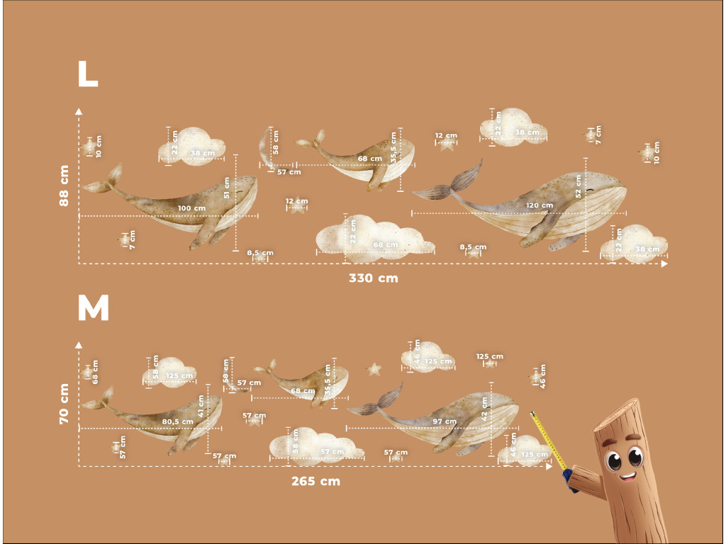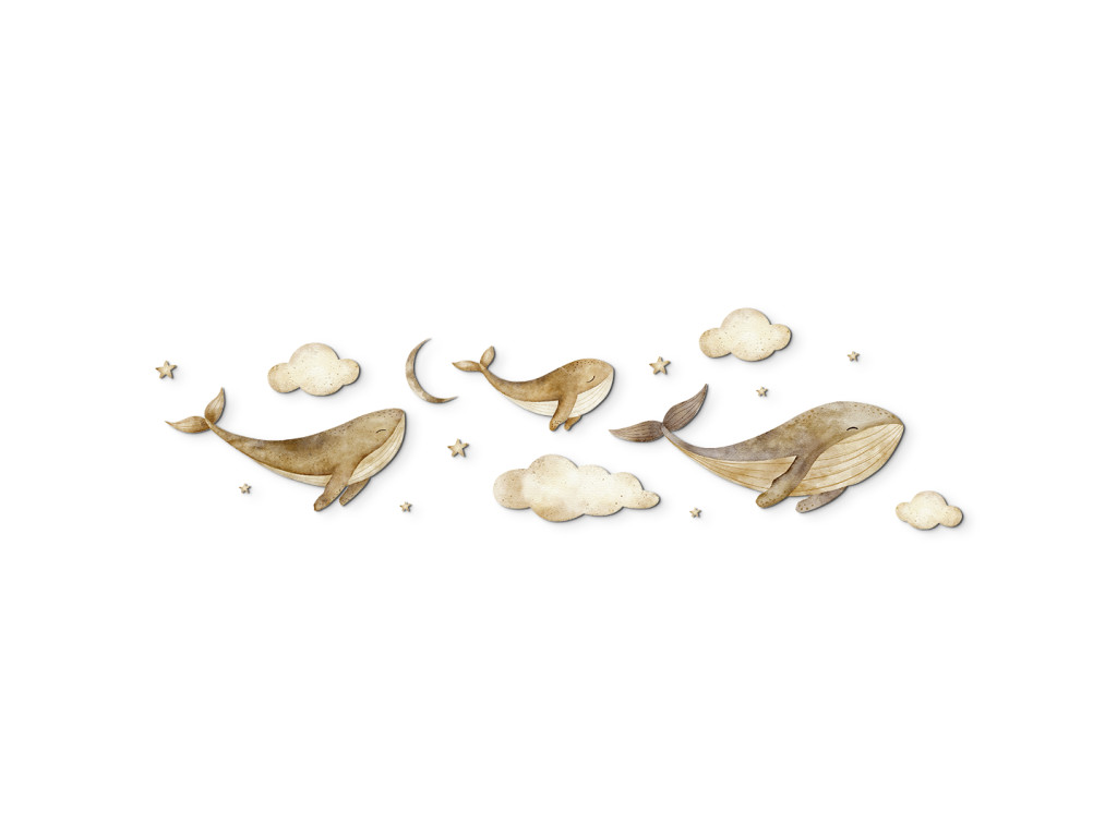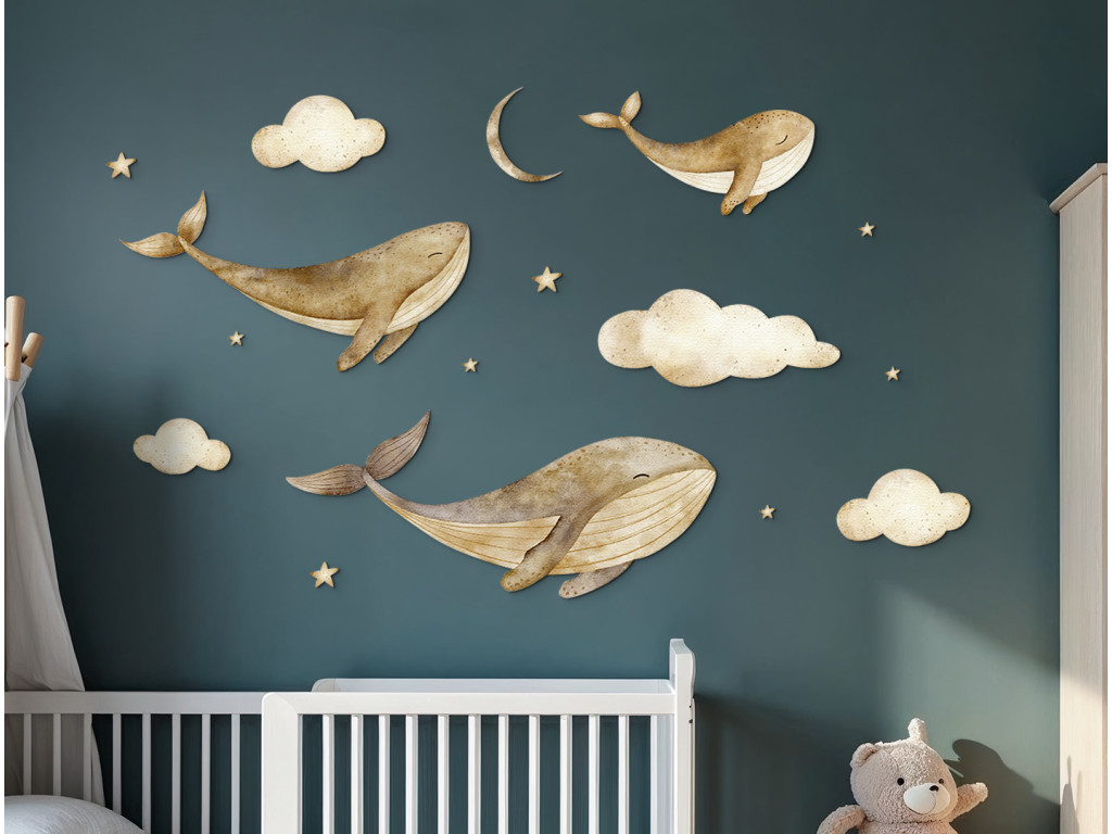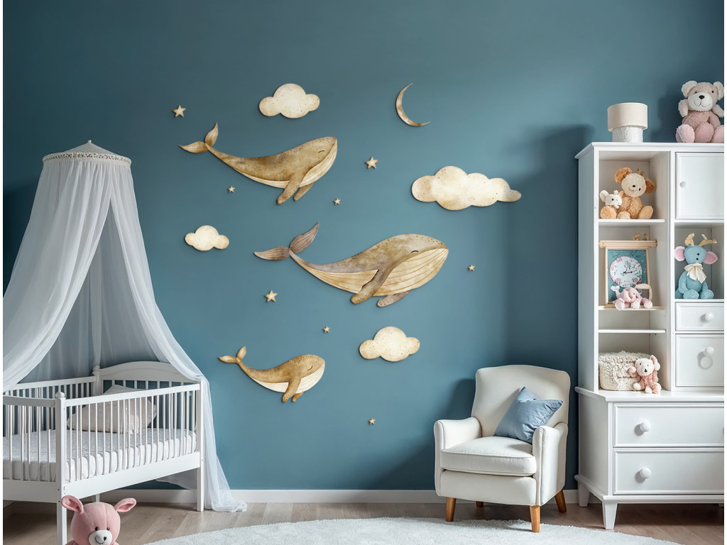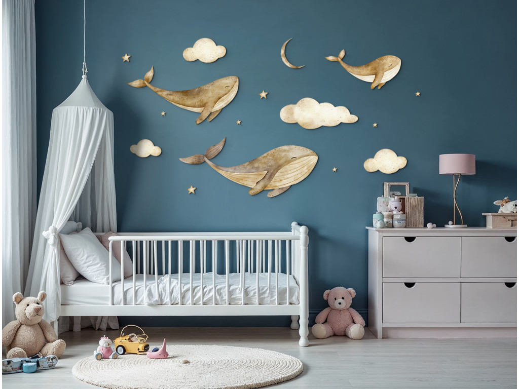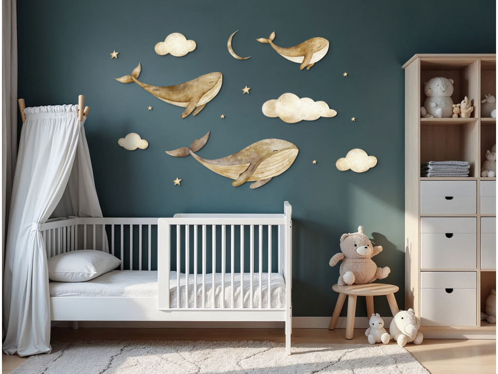 Drei majestätische Walfische schweben anmutig zwischen Wolken und leuchtenden Sternen, als würden sie durch den Nachthimmel gleiten. Eine zarte und traumhafte Dekoration, die dem Raum ein Gefühl der Ruhe, Fantasie und Magie der Unterwasserwelt in Verbindung mit dem Himmel verleiht.