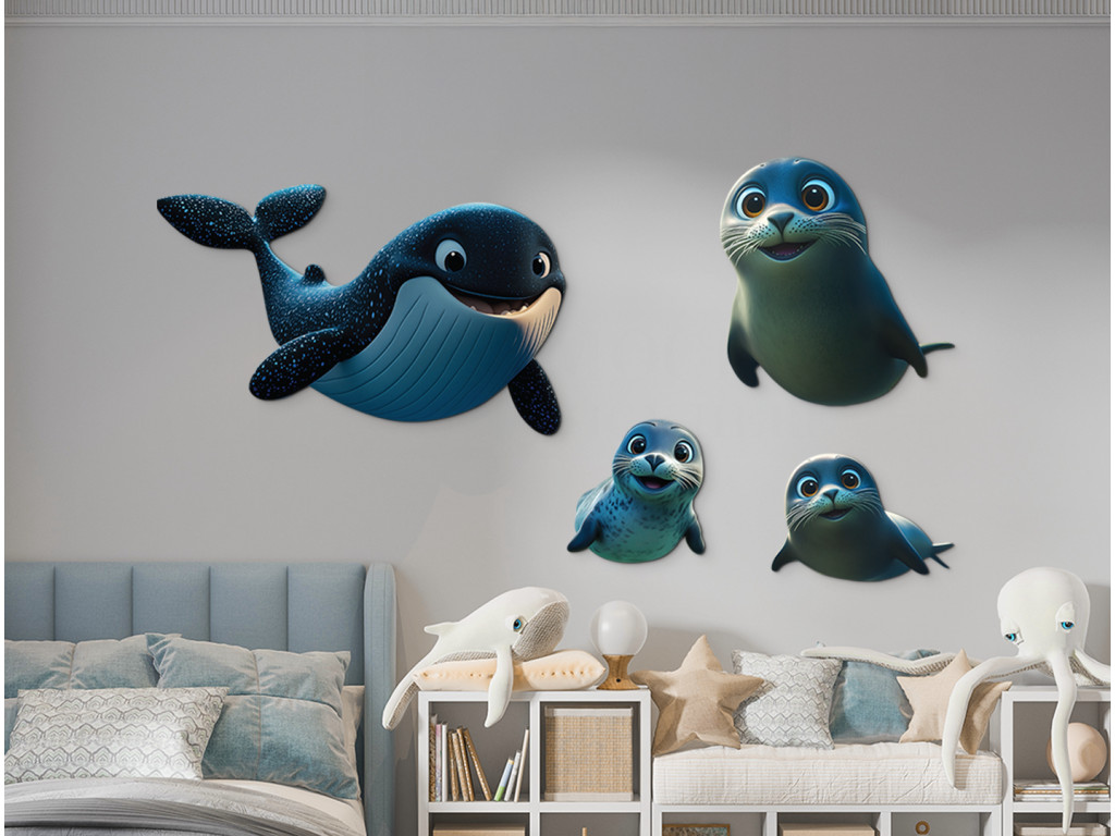Diese entzückende Wanddekoration zeigt einen Wal mit offenem Maul und drei fröhliche Seehunde in verspielten Posen. Alle Figuren haben große Augen, ein freundliches Lächeln und abgerundete Formen, die wie geschaffen für ein Kinderzimmer sind. Die Dekoration wirkt freundlich, fröhlich und fördert die Fantasie und die Liebe zur Meereswelt.