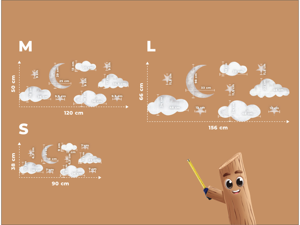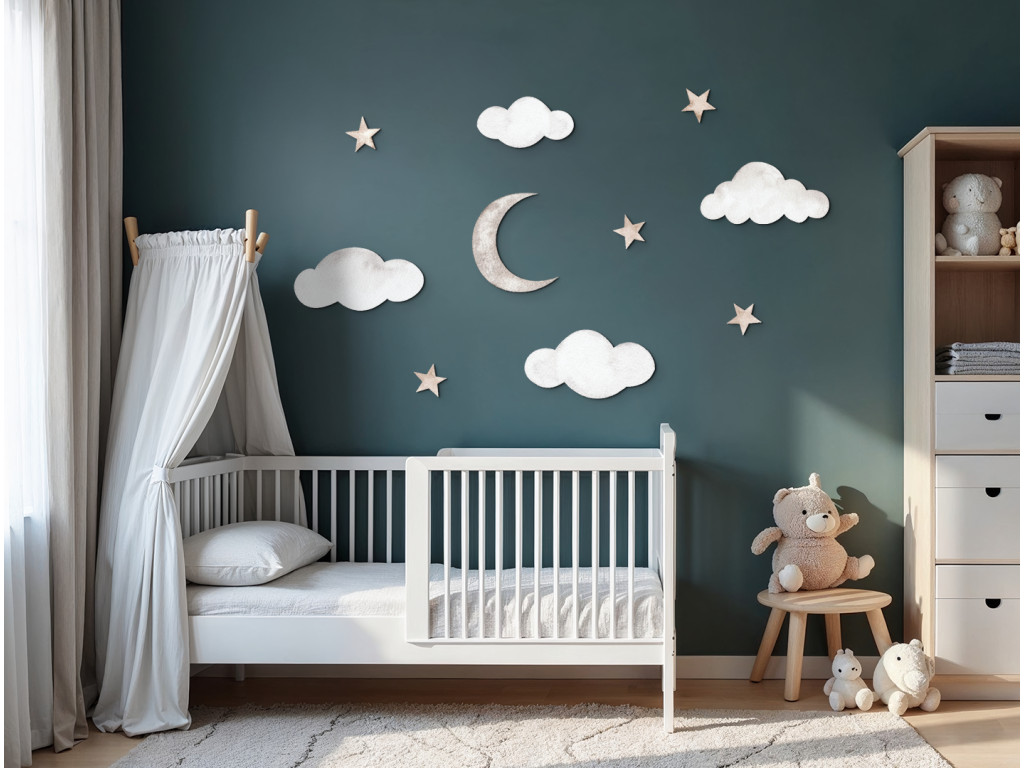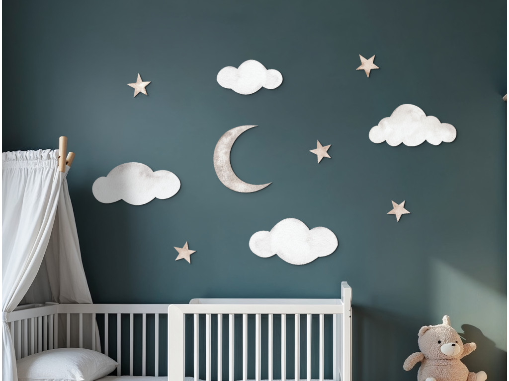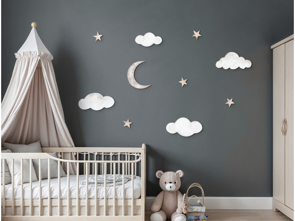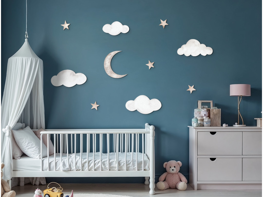 Diese zarte Wanddekoration verwandelt das Kinderzimmer in ein friedliches Traumreich. Wolken, leuchtende Sterne und ein zarter Halbmond schaffen einen zauberhaften Himmel, der ein Gefühl von Sicherheit und Geborgenheit vermittelt. Ideal für einen Schlaf- oder Entspannungsbereich, in dem die Fantasie der Kinder freien Lauf nehmen kann.