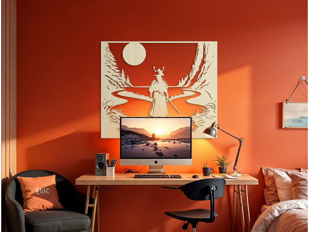 Das Wandgemälde Mondkrieger bringt die geheimnisvolle und kraftvolle Figur eines vom Mondlicht beeinflussten Kriegers in Ihr Heim. Die zarten Details und die nächtliche Kulisse am See schaffen eine Atmosphäre von Mystik und Mut. Eine ideale Dekoration für alle, die ein künstlerisches Element mit einem Hauch von Legende, Natur und Kraft suchen.