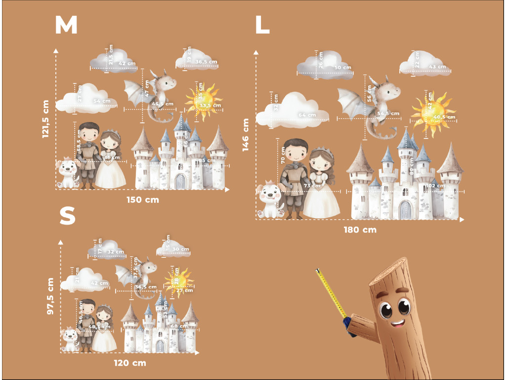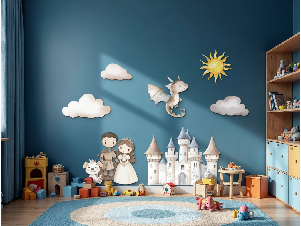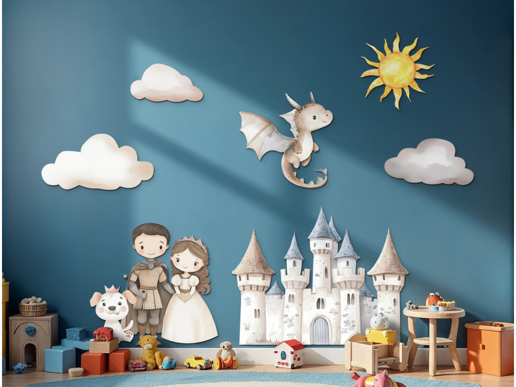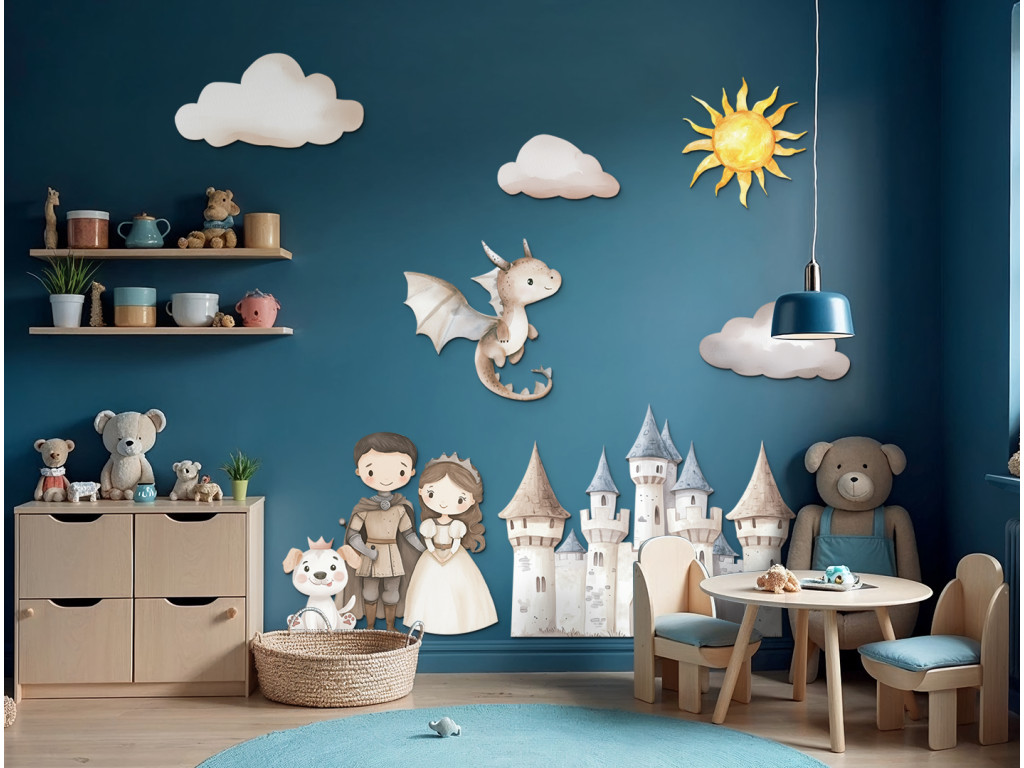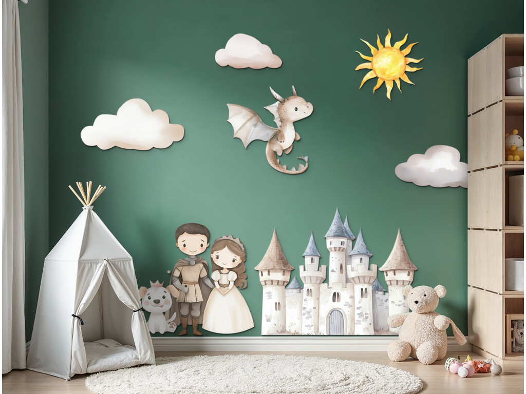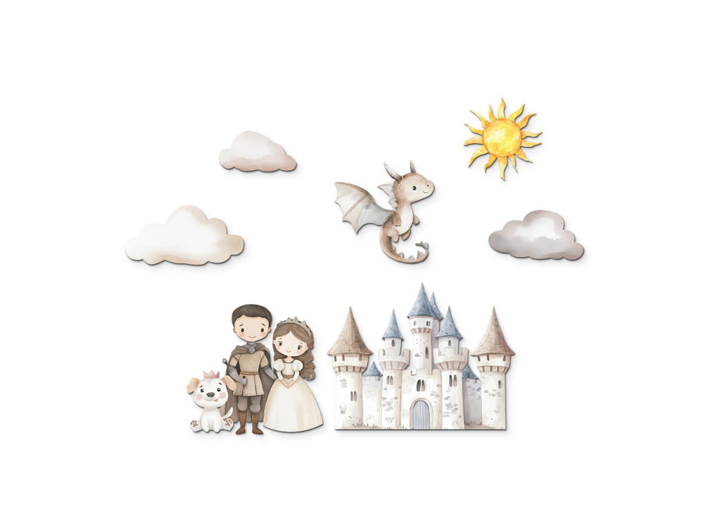 Ein farbenfrohes Set aus Stickern mit einer Burg, einem Prinzen, einer Prinzessin, einem freundlichen Drachen, einem Hund, Wolken und einer Sonne verwandelt das Kinderzimmer in eine zauberhafte Welt voller Fantasie. Ideal für kleine Kinder, die Märchen und Abenteuergeschichten lieben.