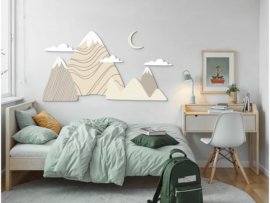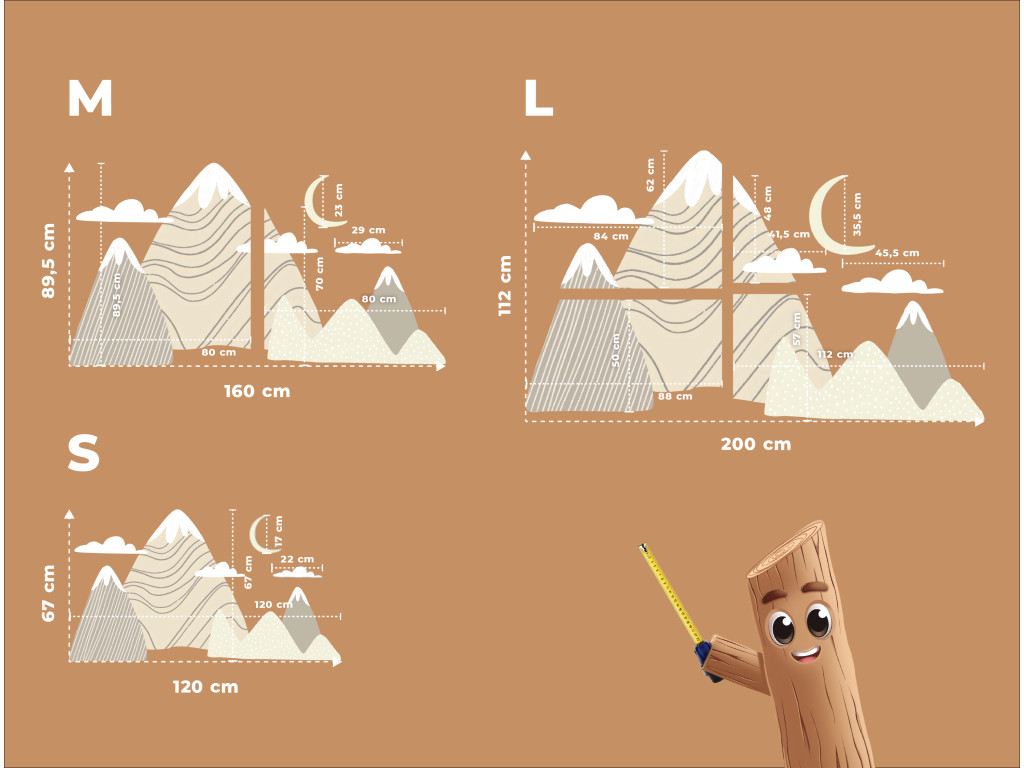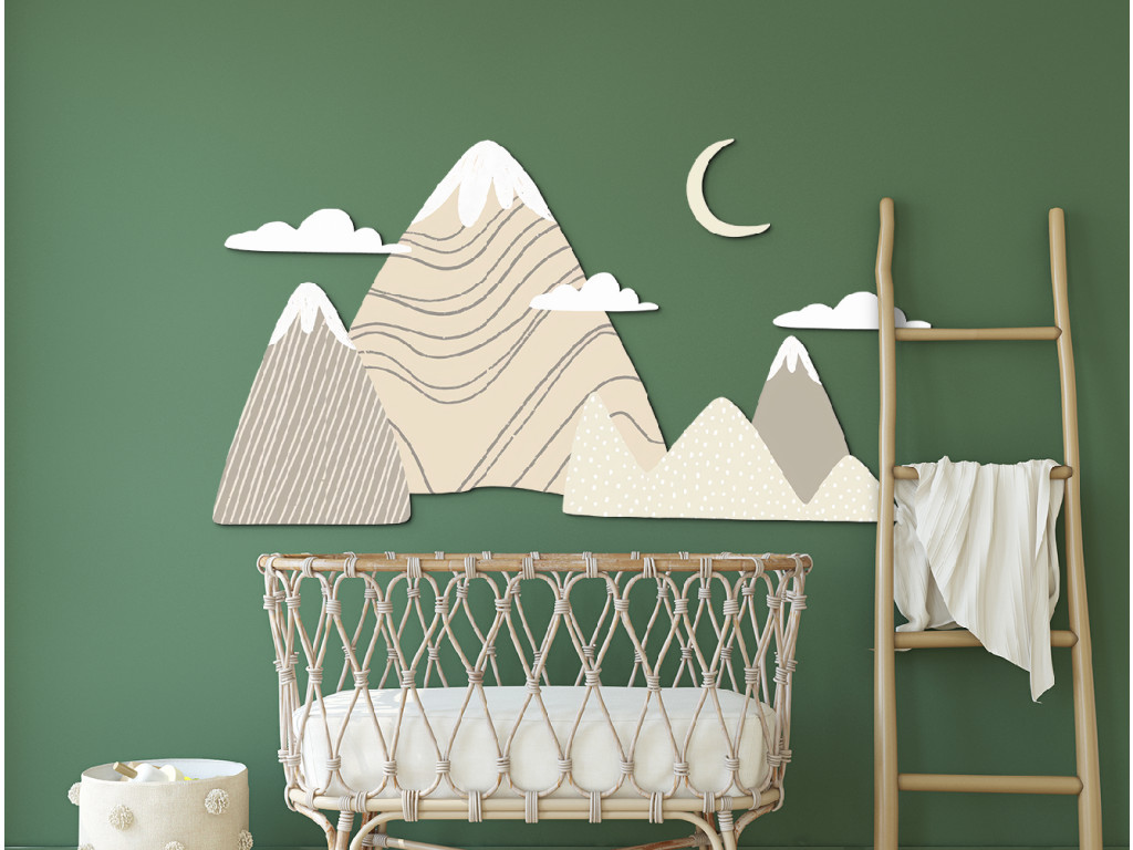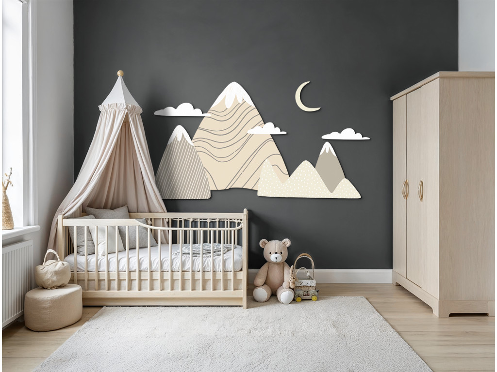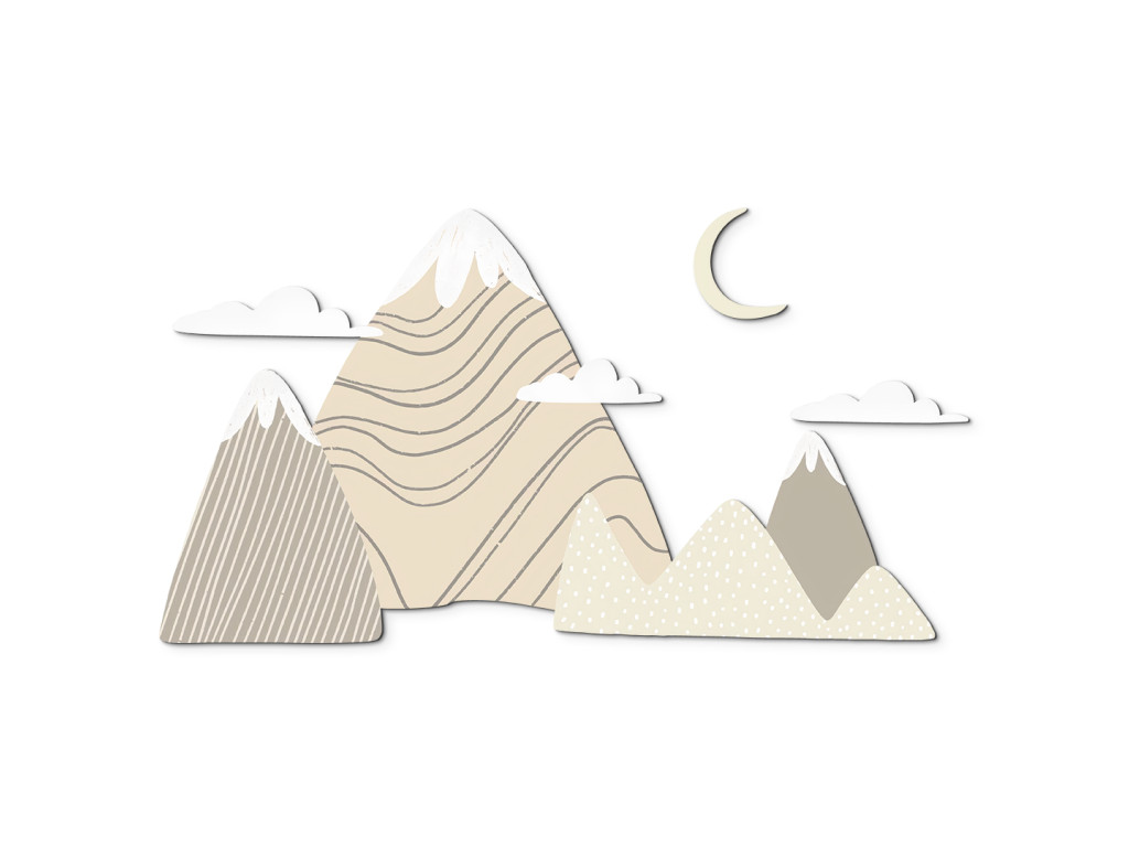 Die Dekoration Mondberge hüllt das Kinderzimmer in eine weiche Palette aus Beige- und Cremetönen. Die sanft geschichteten Bergformen mit schneebedeckten Gipfeln wirken beruhigend und elegant, wobei jedes Detail präzise ausgeschnitten ist. Über den Bergen schweben weiße Wolken und ein strahlender Mond, was eine ruhige, traumhafte Stimmung schafft.
