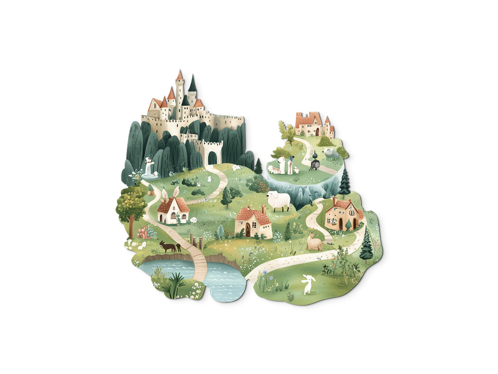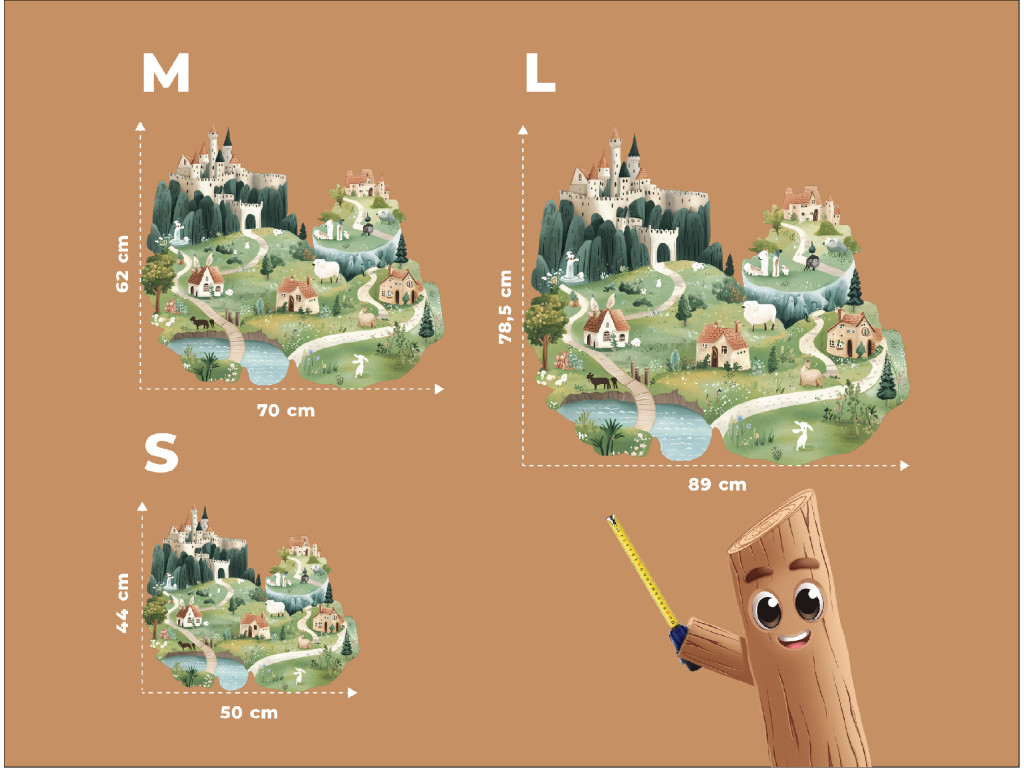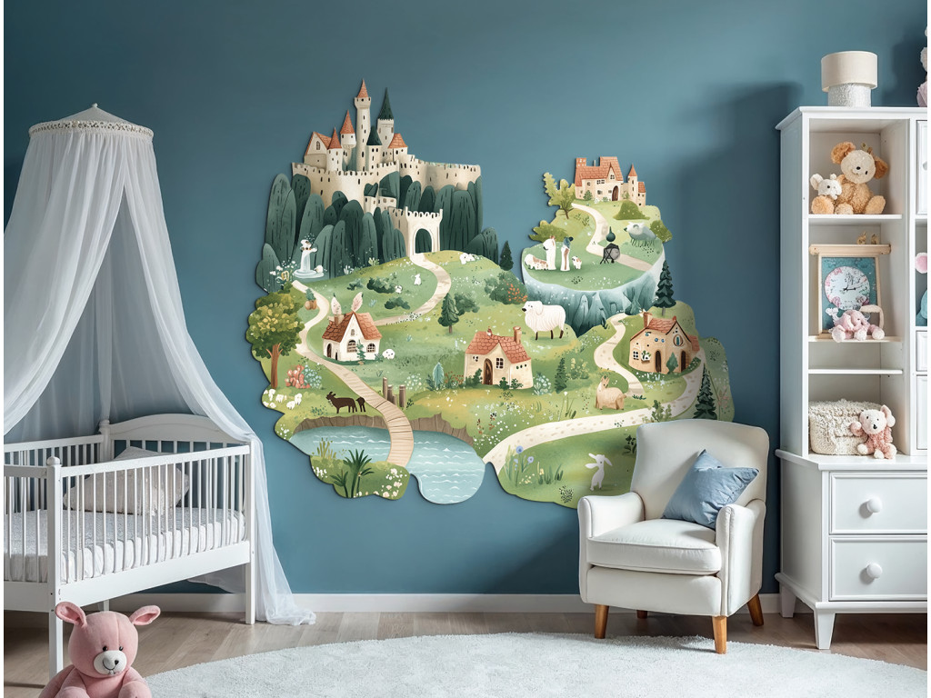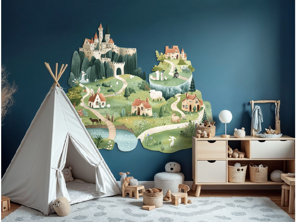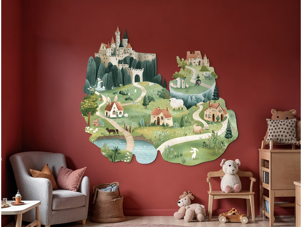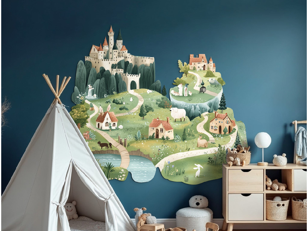Farbenfrohe und fröhliche Wanddekoration, die eine malerische Landschaft unter einer majestätischen Burg zeigt. Auf der Illustration finden Sie Häuser, Tiere, Bäche, Wiesen und gewundene Wege, die zusammen eine harmonische und verspielte Szenerie bilden. Ideal, um das Kinderzimmer zu beleben und die Fantasie kleiner Entdecker anzuregen.