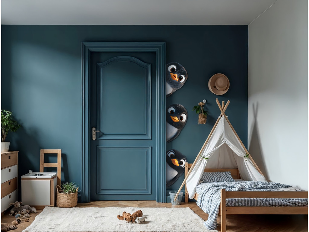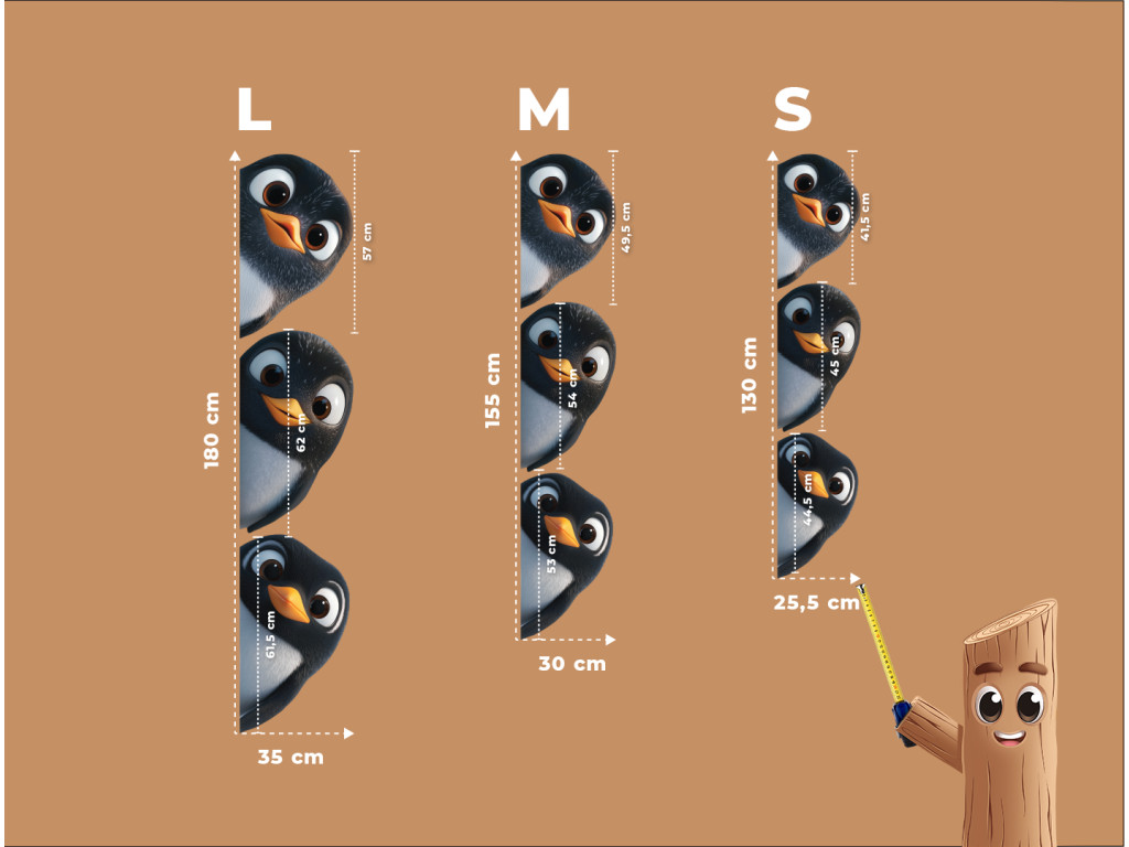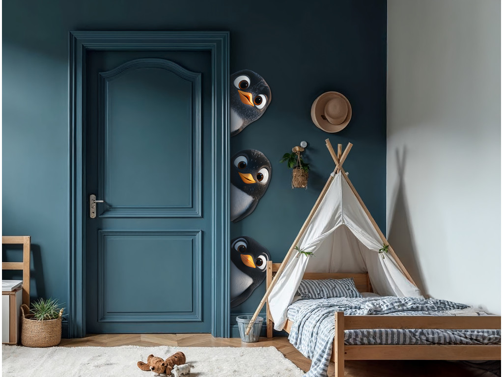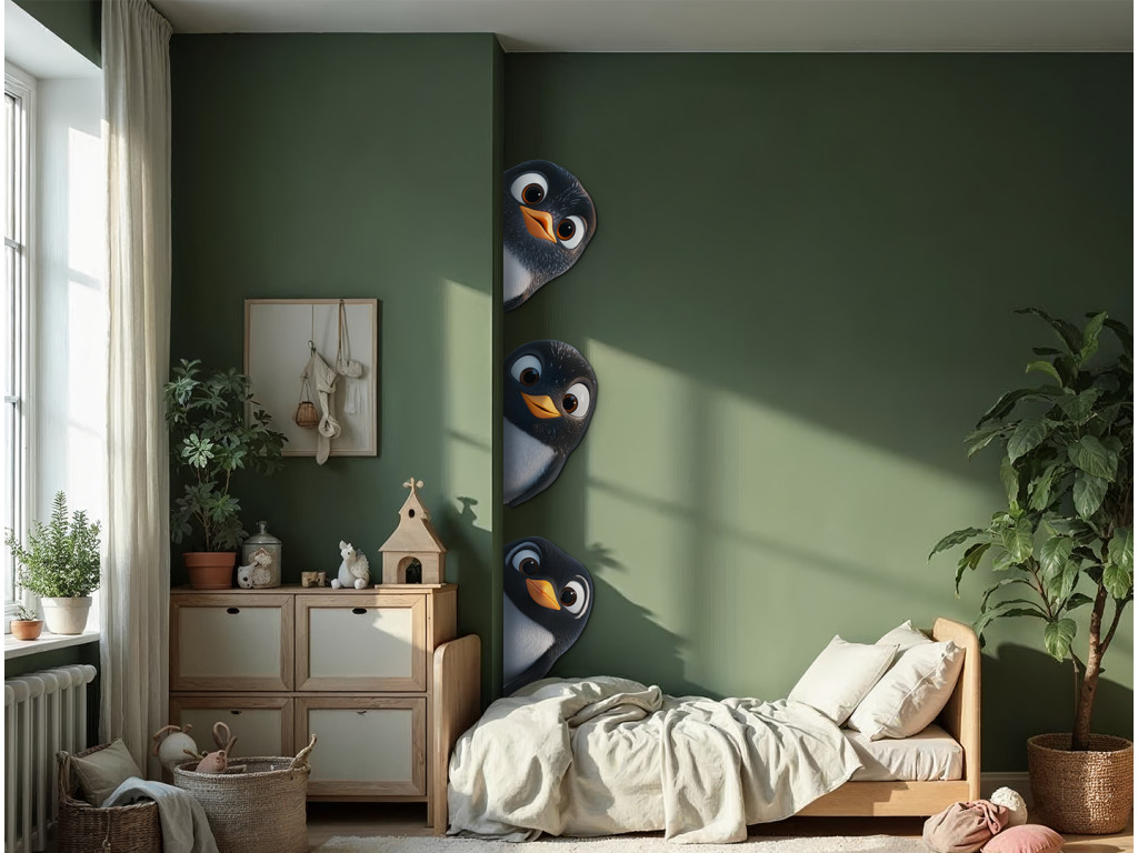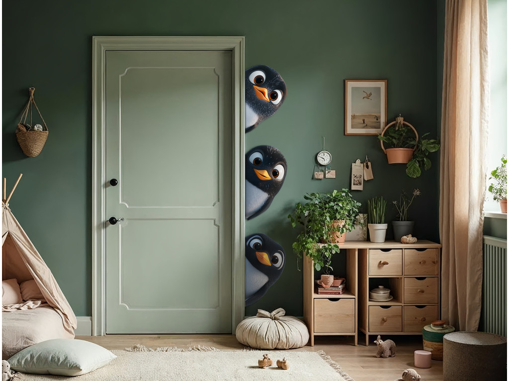 Fröhliche Dekoration, auf der neugierige Pinguine beispielsweise hinter einer Ecke oder einer Tür hervorschauen. Ideal, um ein Kinderzimmer oder eine Spielecke aufzuhellen, und bringt Verspieltheit und Freude in den Raum.