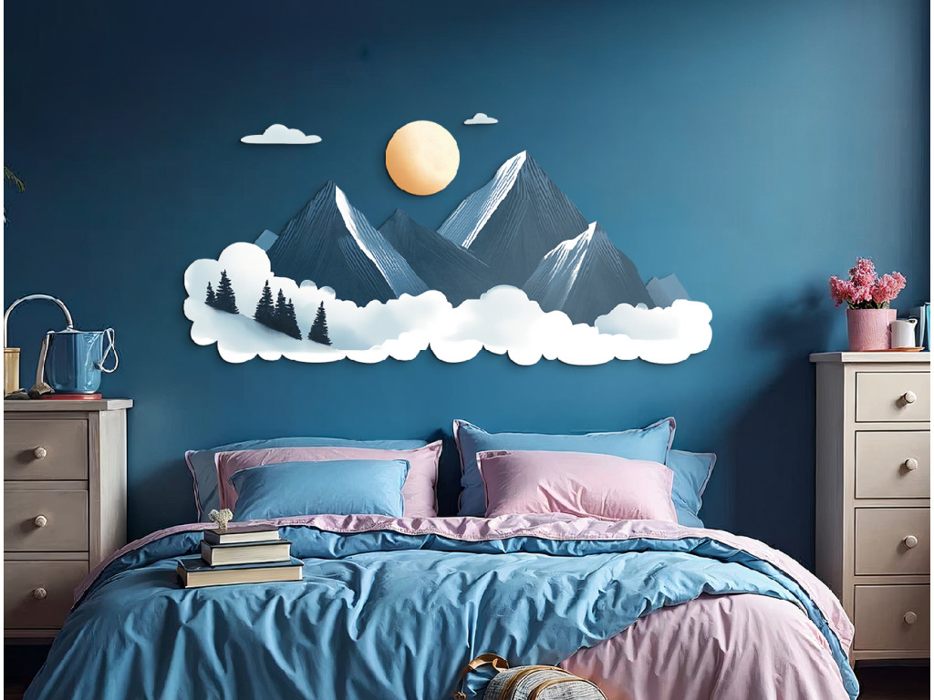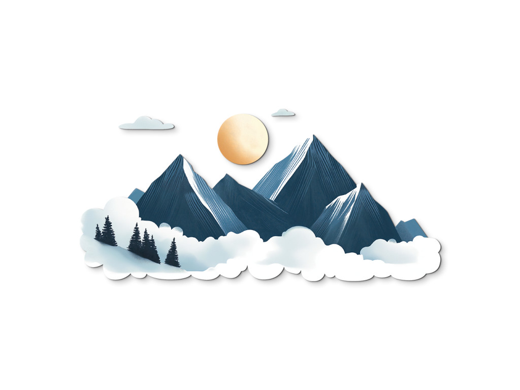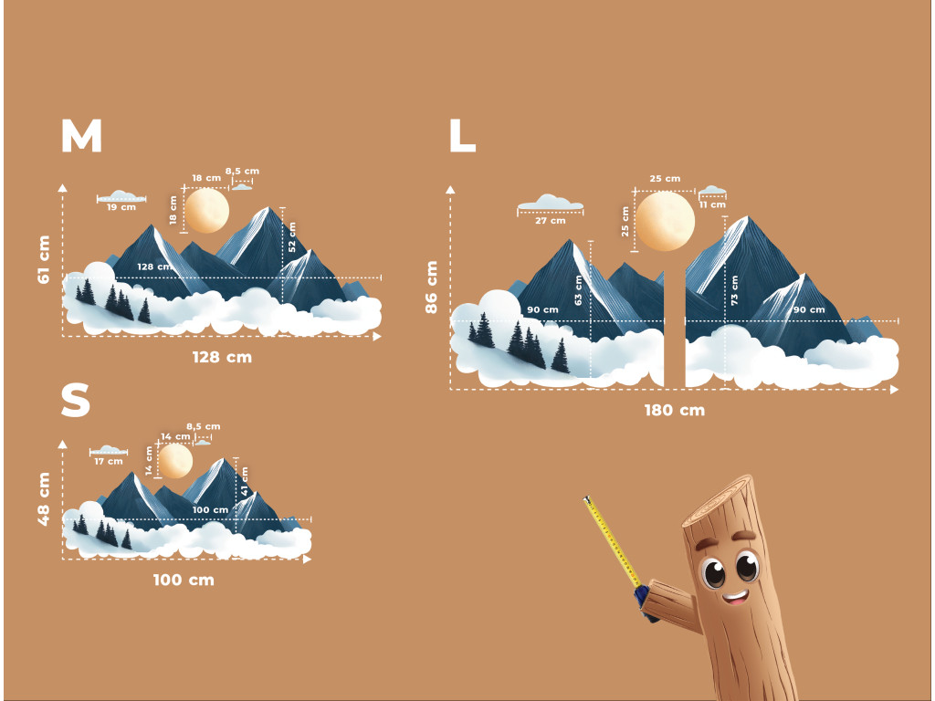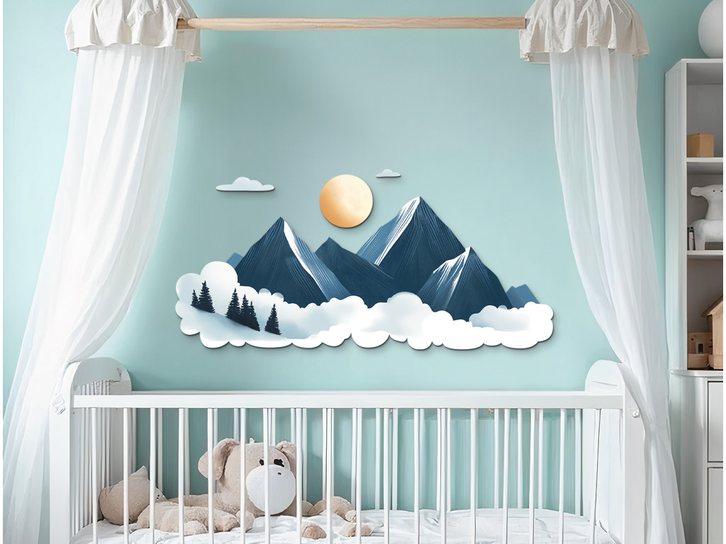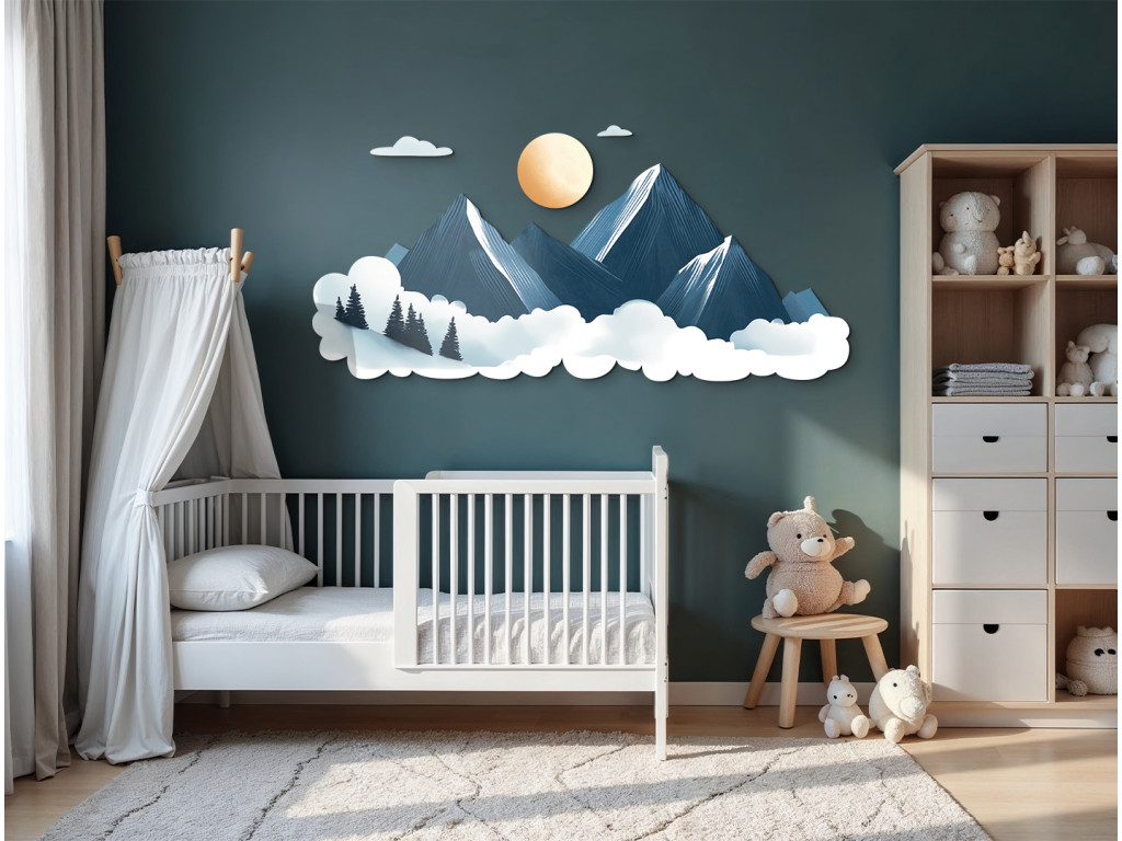 Diese Wanddekoration für Kinderzimmer mit dem Namen Sonnige Berge zeigt eine einfache Berglandschaft mit sanftem Sonnenschein und Wolken. Minimalistische Formen und eine angenehme Farbpalette bringen Ruhe und Harmonie in den Raum. Die ideale Wahl für alle, die ein klares Design mit einem liebevollen kindlichen Touch suchen.