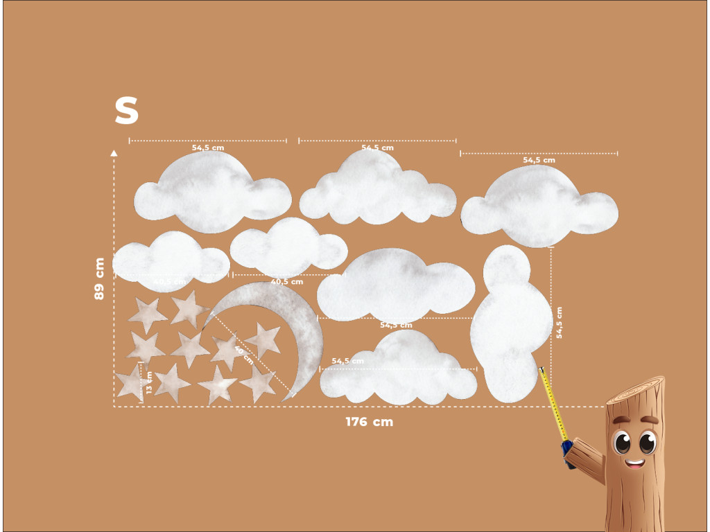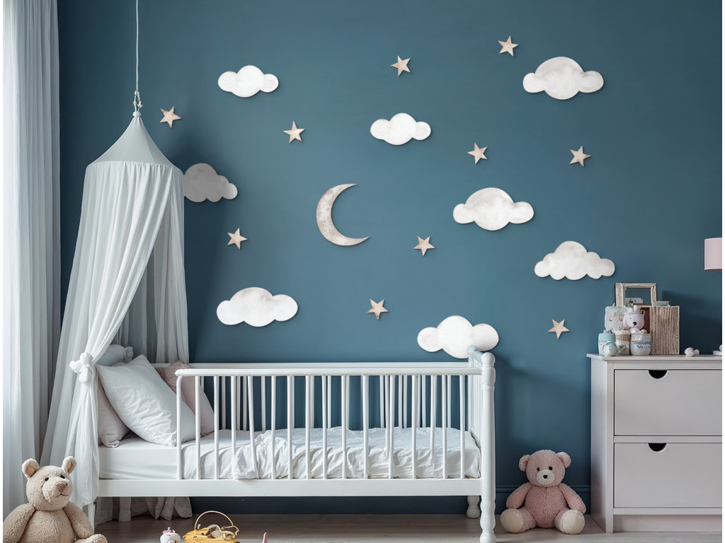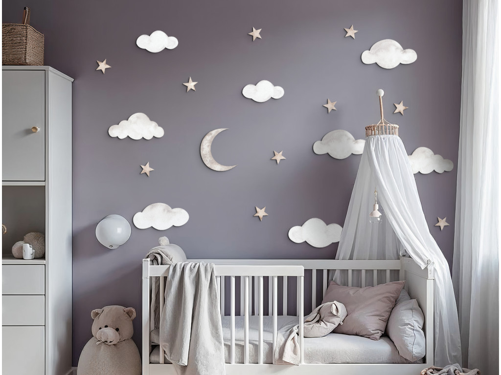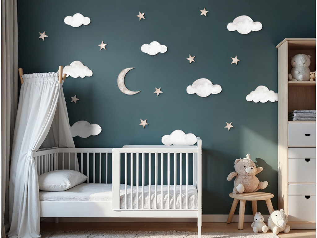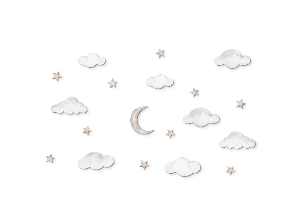 Eine zarte Dekoration, die den Zauber des Nachthimmels in den Raum bringt. Das Set enthält Wolken, Sterne und einen Halbmond, die zusammen eine ruhige und traumhafte Atmosphäre schaffen. Ideal, um eine gemütliche Atmosphäre im Kinderzimmer oder Schlafbereich zu schaffen.