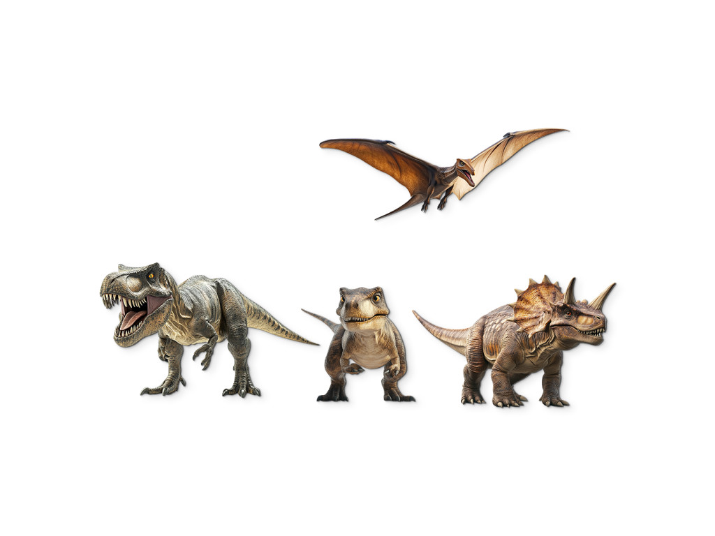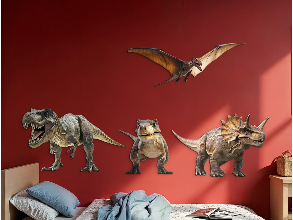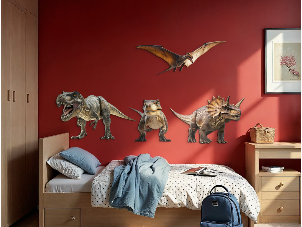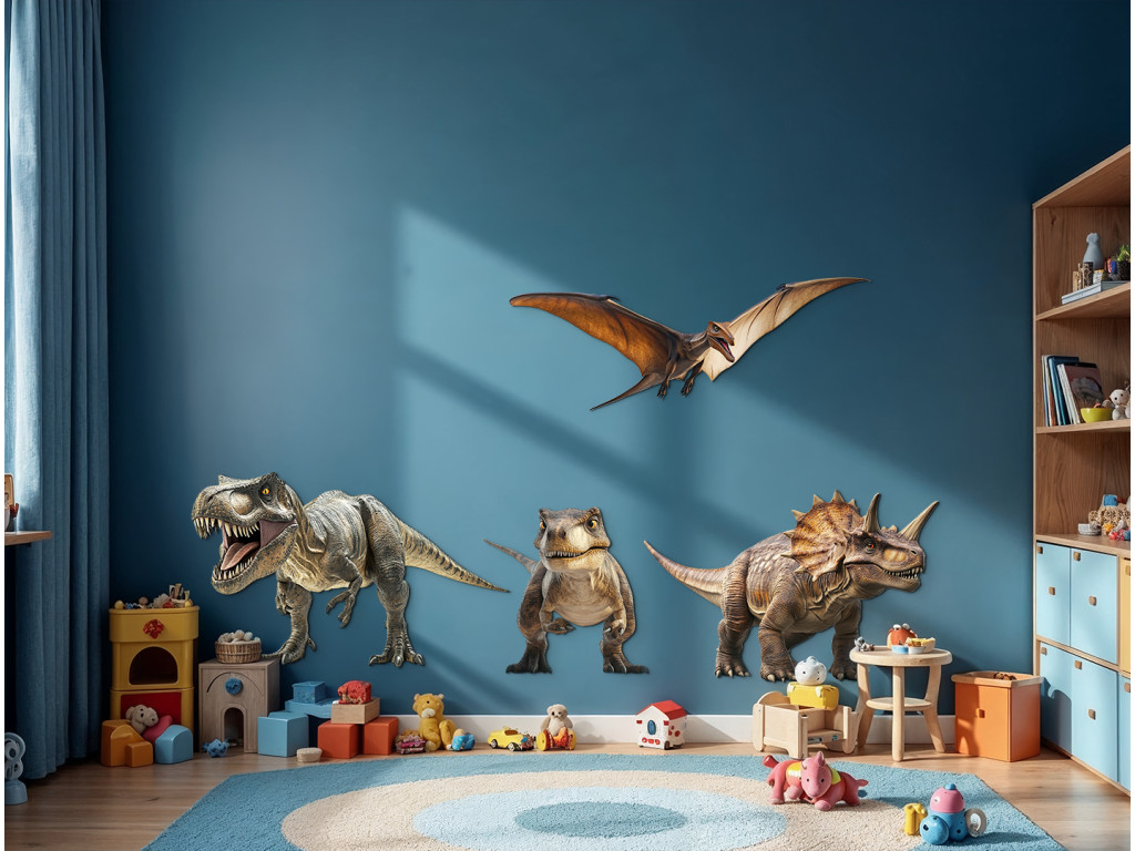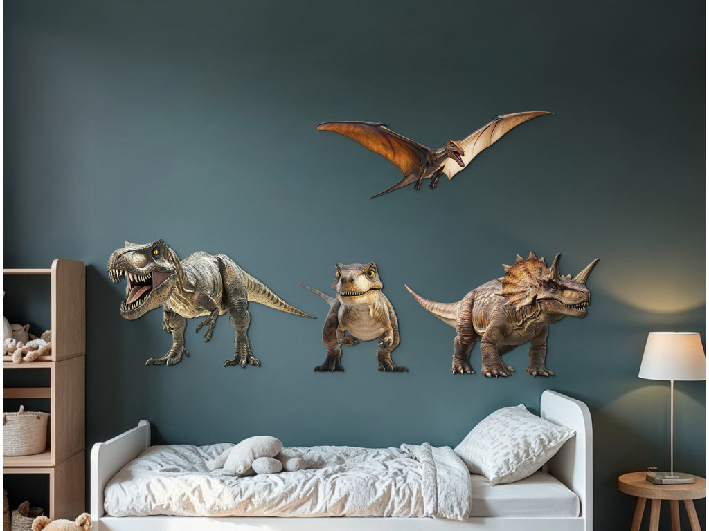 Ein gezeichnetes, aber realistisch gestaltetes Set mit vier Dinosauriern, ideal für Kinder, die sich bereits stärker für die prähistorische Welt interessieren. Dank ihrer detailreichen und zugleich freundlichen Gestaltung bringen sie eine abenteuerliche Atmosphäre in das Zimmer und wecken die Neugier auf längst vergangene Zeiten.
