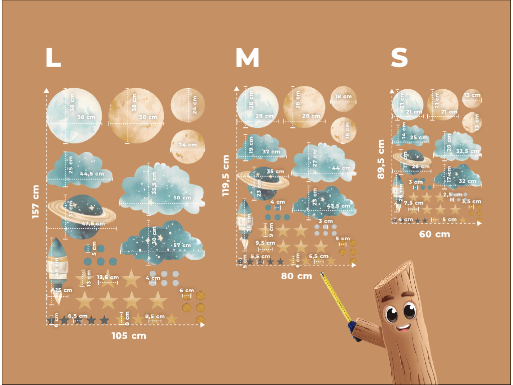 Dekorationsset mit Motiven von Planeten, Raketen, Wolken und Sternen in sanften Pastellfarben. Ideal, um eine ruhige und traumhafte Atmosphäre im Kinderzimmer mit einem Hauch von Weltraumabenteuer zu schaffen.